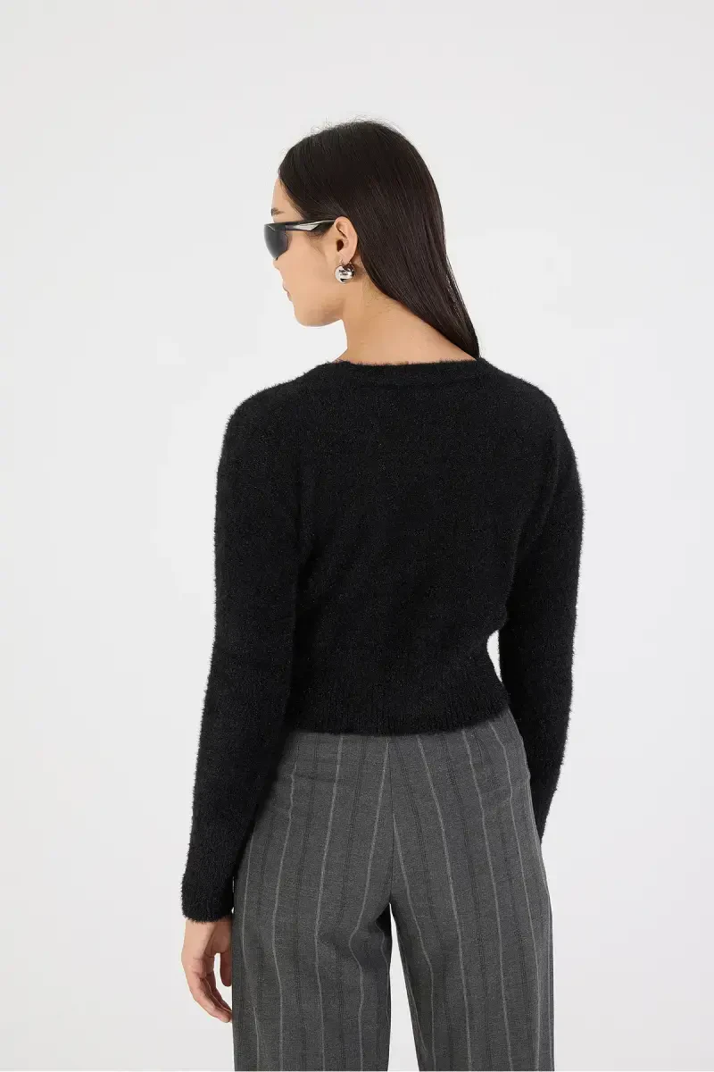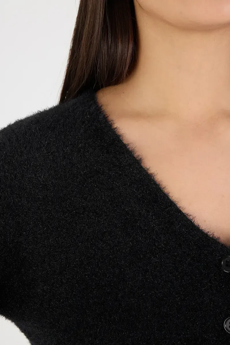 Soft Textured Buttoned Crop Cardigan H3339-a2-Black is a candidate to be the indispensable of your wardrobe! This cardigan, offered with Addax quality, is an ideal choice for women who are looking for elegance and comfort together. While offering a modern look thanks to its crop cut, its soft texture provides a comfortable wearing experience all day long. The V-neck detail adds a feminine touch, while the front buttoned design makes it easy to put on and take off. Elastic knits on the cuffs and hem preserve the shape of the cardigan while creating a stylish detail.This cardigan is a versatile piece that you can use in your different combinations. You can create a casual style with jeans, or you can achieve a more stylish look with skirts. You can create different styles by wearing a basic t-shirt or blouse inside. This cardigan, which you will feel like you are not wearing thanks to its soft texture, is a piece that you can use in every season. You can use it alone in spring and autumn months, and you can stay warm and maintain your elegance by wearing it inside your coat in winter months.The black color easily adapts to any combination, while the crop cut reveals your body lines. This cardigan, offered as a standard size, is designed to fit different body types. Colors may vary due to light differences in product shots, so the color of the product may be slightly different from what you see in reality. However, this does not affect the elegance and usefulness of the cardigan. Let your style speak with this stylish and useful cardigan!