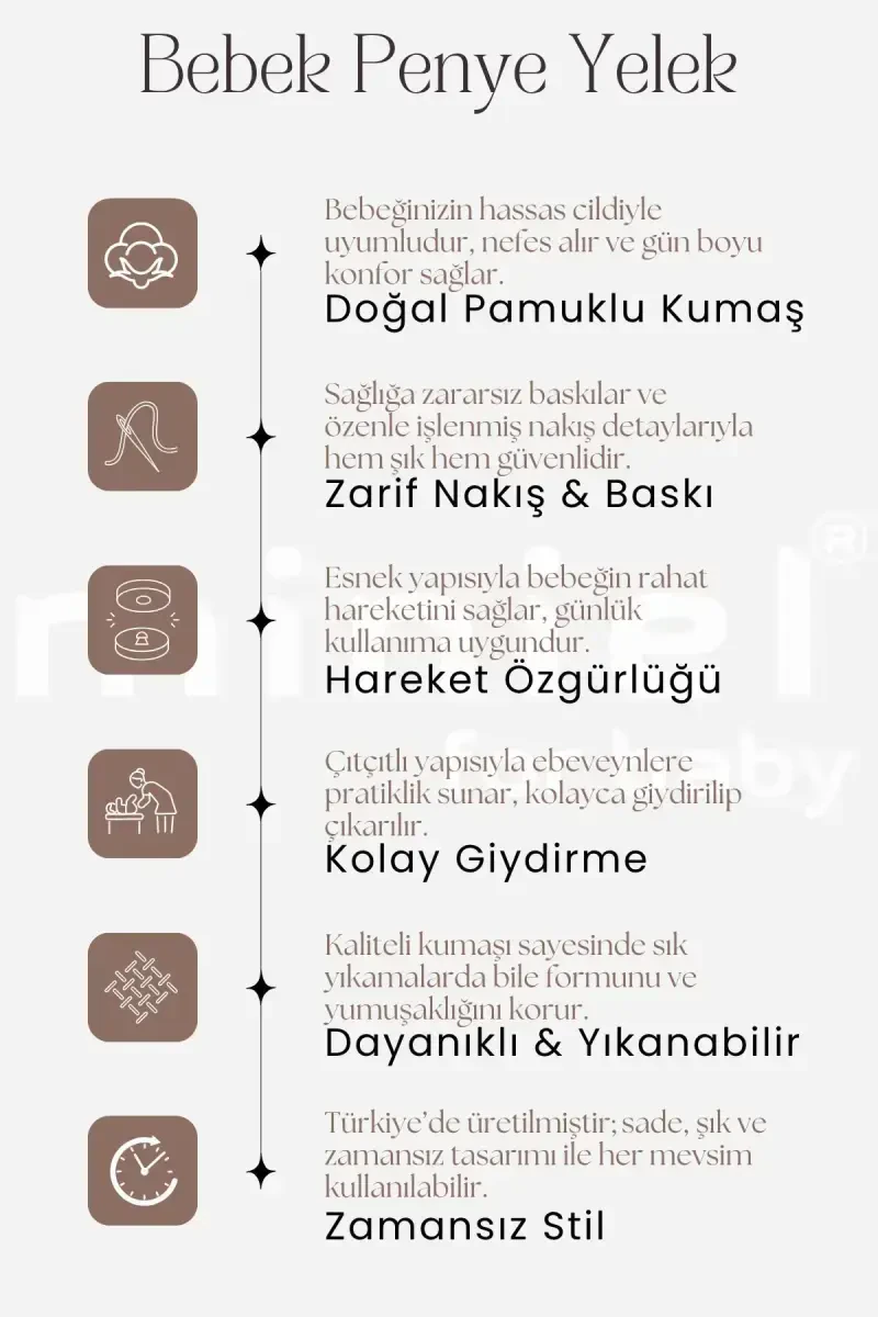 Kichkina malikaningizning yumshoq terisiga eng tabiiy teginishni taqdim etish uchun ehtiyotkorlik bilan ishlab chiqilgan 2 ta penye bolalar yelegi organik paxtadan tikilgan. Ayiqcha kashtado'zligi bilan bezatilgan yelek, ham zamonaviy, ham yoqimli ko'rinishga ega. 3-6-9 oylik o'lchov oralig'i bilan yelegingiz chaqalog'ingiz o'sib borish jarayonida qulay foydalanishi mumkin, uning paxta to'qimasi nafas oladigan va chaqalog'ingizning nozik terisini tirnash xususiyatiga ega emas.