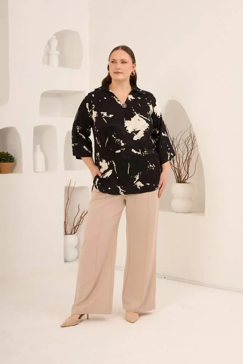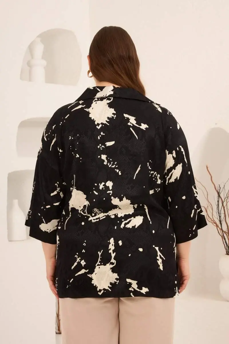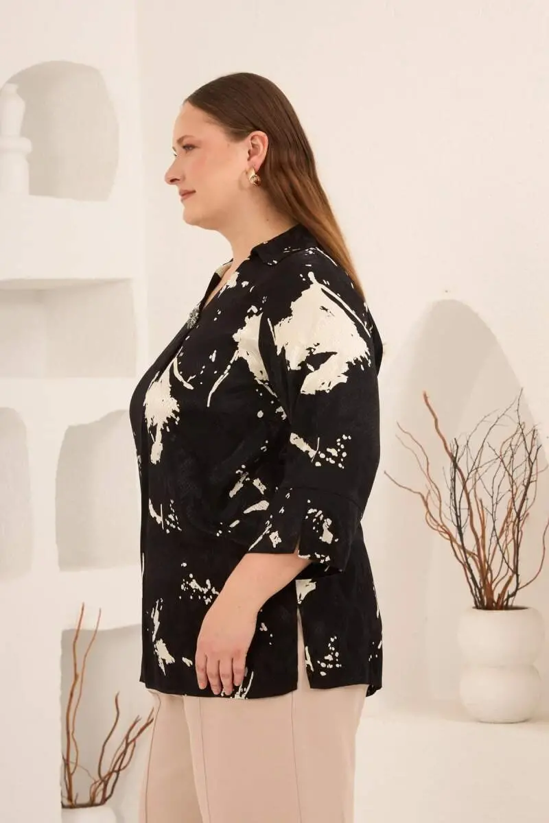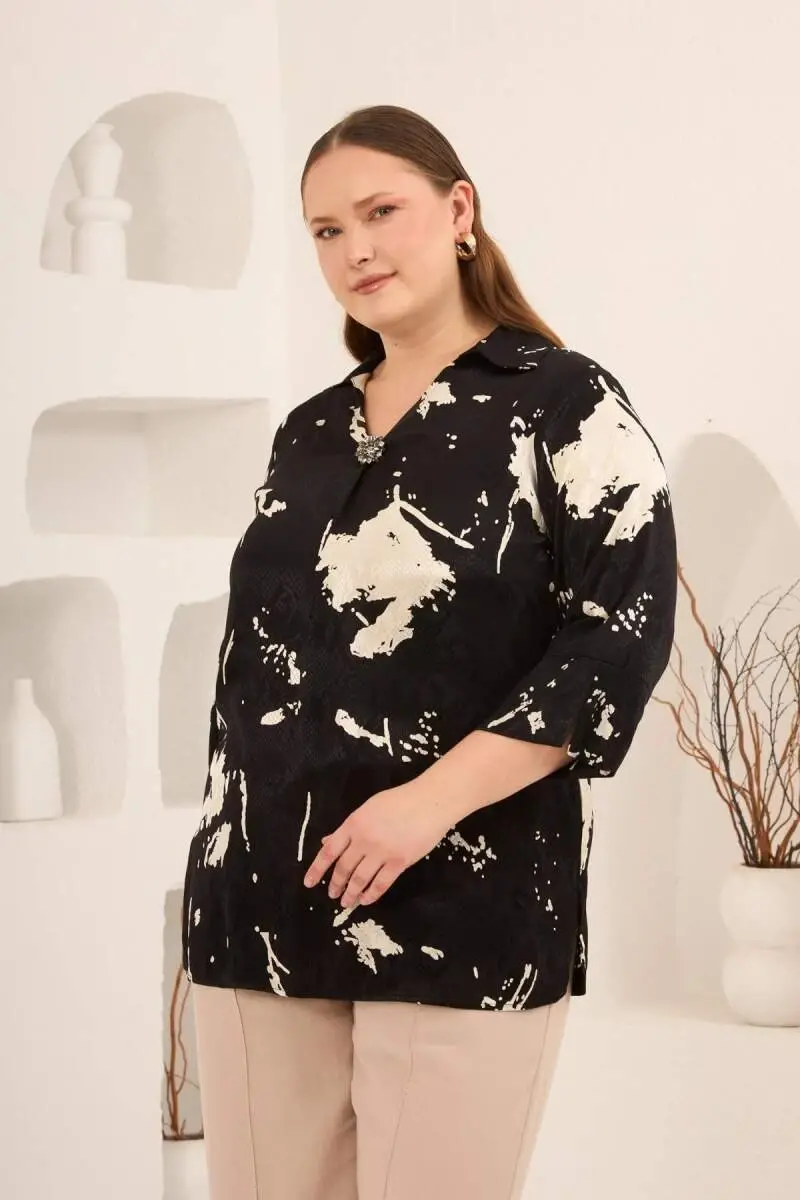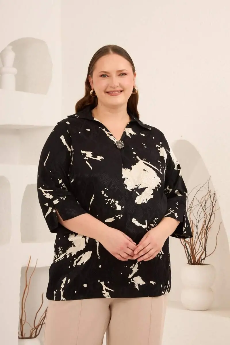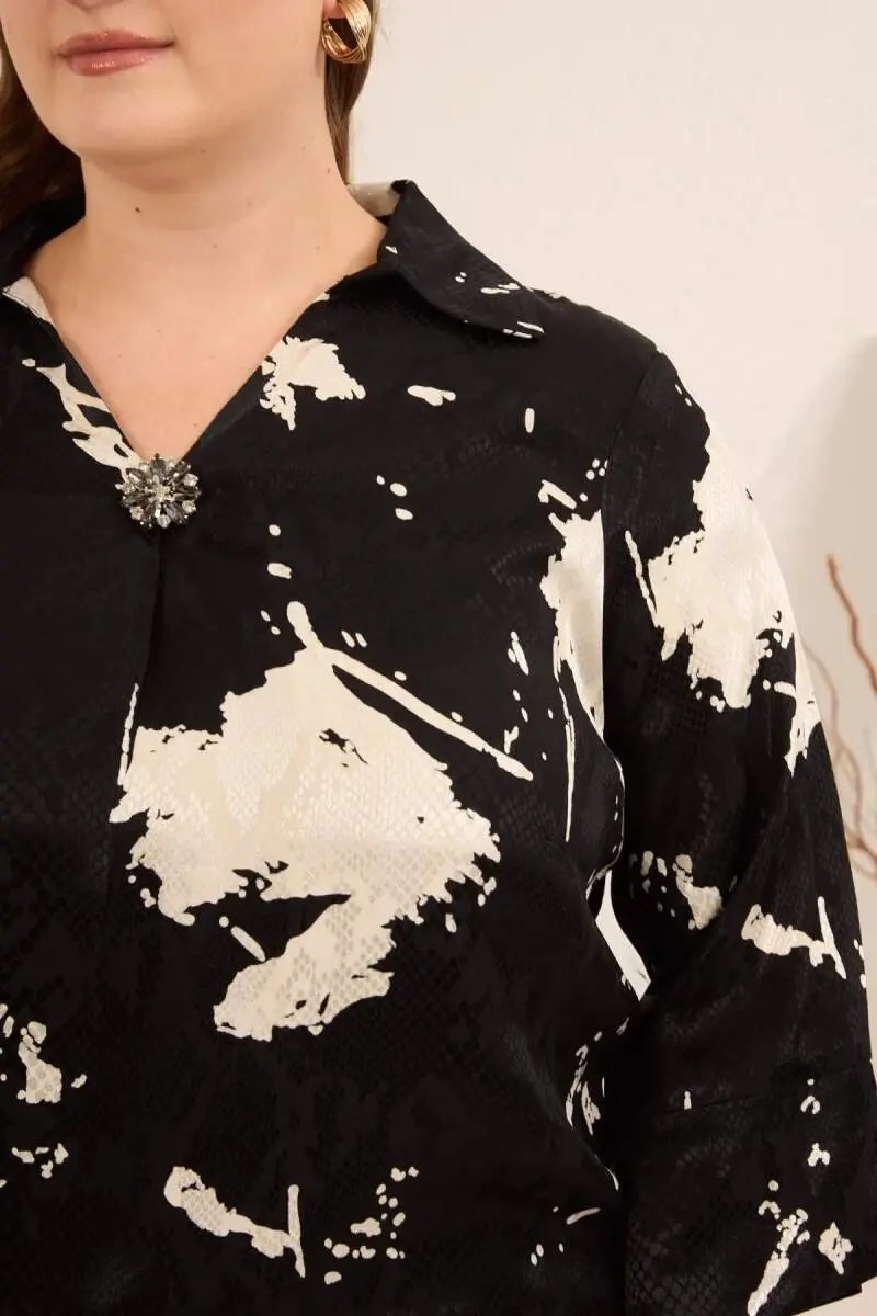 Soyut Desenli Broş Detaylı Kadın Büyük Beden Bluz Siyah