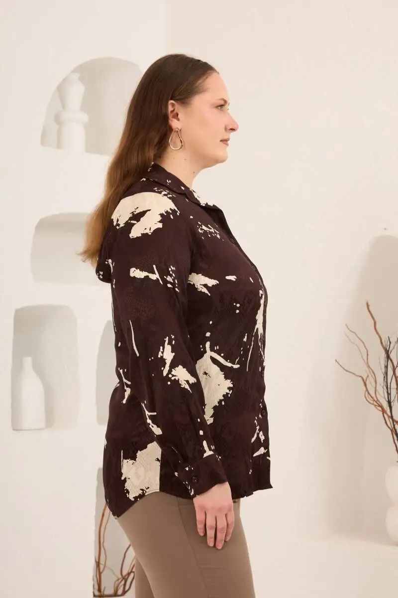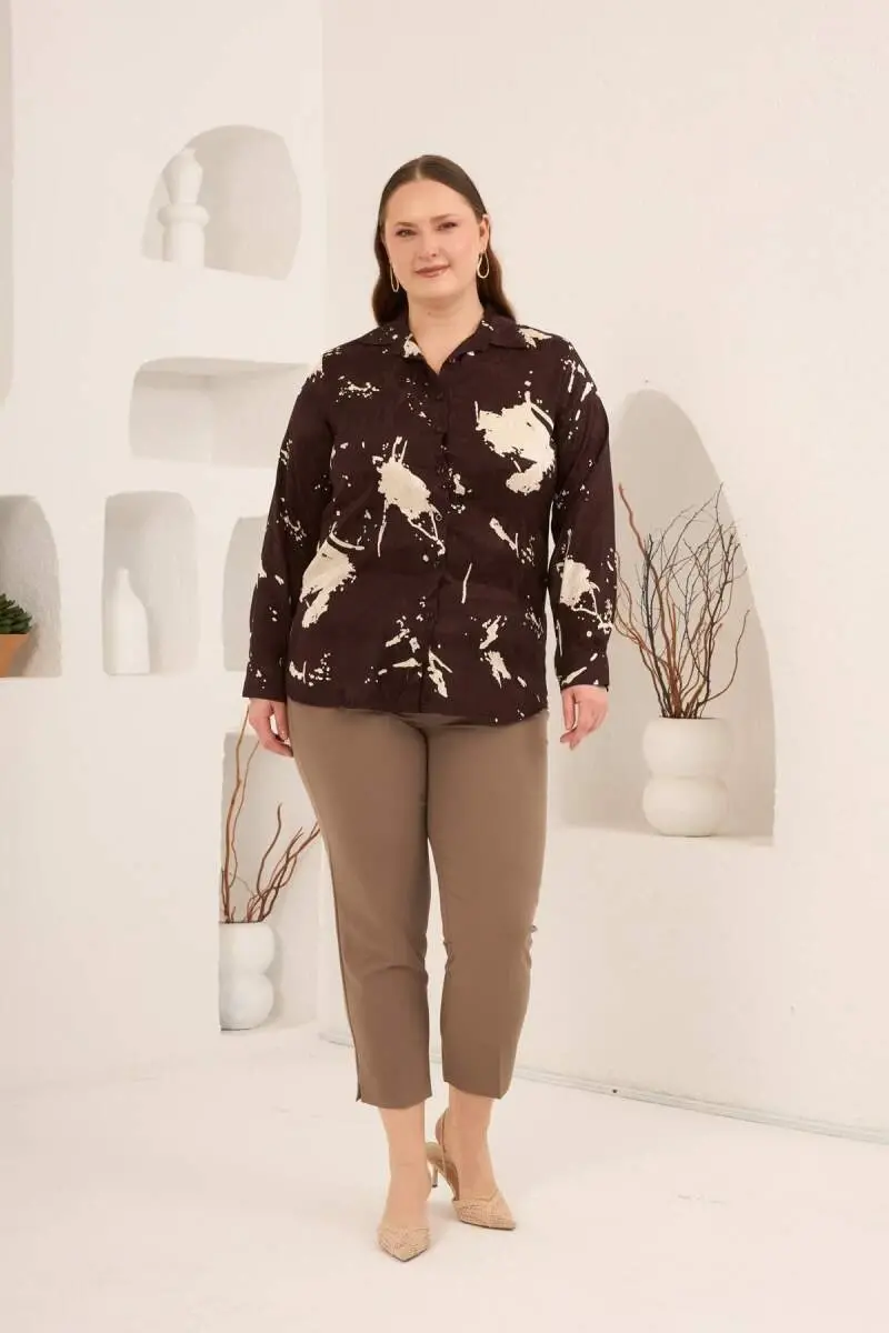 Soyut Desenli Kadın Büyük Beden Uzun Kol Gömlek Kahve
