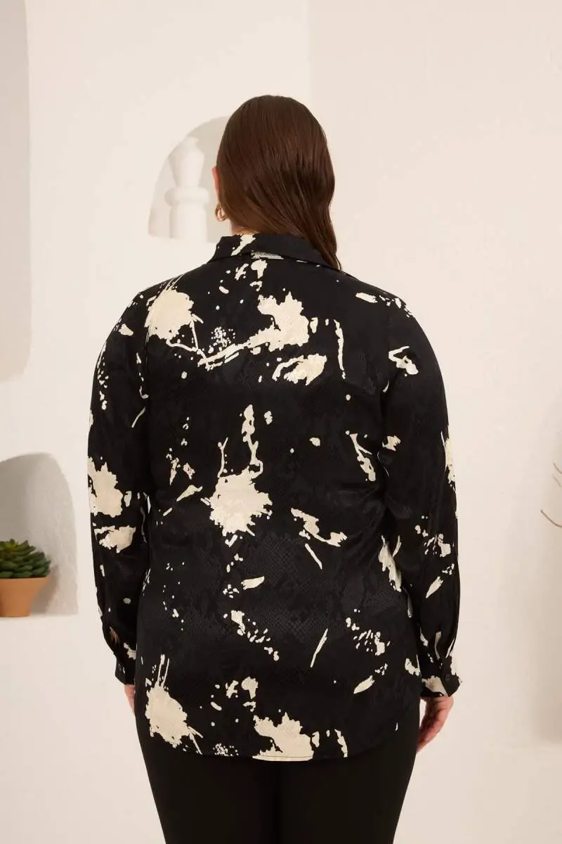 Soyut Desenli Kadın Büyük Beden Uzun Kol Gömlek Siyah