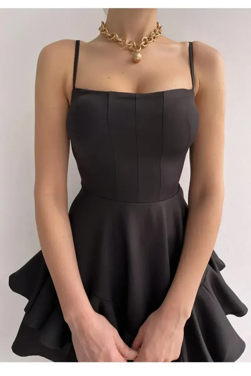 Qora kechki libos, bitiruv libosi, ingichka kamarli libos, qatlamli detallari bor libos, sozlanishi mumkin bo'lgan kamarlikli libos, chiroyli libos, maxsus tadbir libosi, zamonaviy libos, nafis libos, qora bitiruv