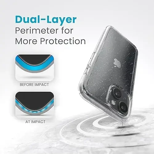 Protect your phone with style with the Speck Clear iPhone 15 Case! This slim and elegant case is a perfect fit for iPhone 15, iPhone 14, and iPhone 13 models. It protects your phone's 6.1-inch screen from scratches, bumps, and drops, while allowing you to showcase the original design of your phone. Its transparent structure and eye-catching GemShell Platinum Glitter details add a sophisticated touch to your phone.The Speck Clear iPhone 15 Case is not only a stylish accessory, but also stands out with its superior protection features. This case, which is resistant to drops up to 8 feet, keeps your phone safe thanks to its two-layer design and internal protective cushioning. The raised camera ring protects your lenses from scratches, while the raised bezel prevents your screen from being damaged in face-down drops.The design of the case is made with ease of use in mind. Thanks to its slim and lightweight structure, you can easily carry your phone in your pocket and use it easily with one hand. It has precise cutouts that allow easy access to all buttons, speakers, and charging port. In addition, thanks to the case's wireless charging compatibility, you can wirelessly charge your phone without removing the case. There is no magnet inside the case.The Speck Clear iPhone 15 Case not only protects your phone, but also offers long-lasting use. It is made of special materials that prevent yellowing against UV rays, so your case stays transparent and like new for a long time. Fade-resistant real glass glitter embedded in the case adds sparkle without electromagnetic interference. Speck Products, which has been producing award-winning designs since 2001, designed this case by combining style, function and superior quality. If you are looking for reliable and stylish protection for your phone, the Speck Clear iPhone 15 Case is an excellent choice.