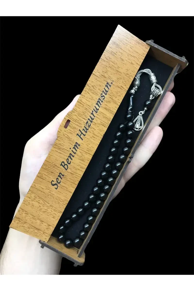 Oltu stone rosary, sphere cut, wooden box, handmade, Erzurum, black amber, rosary, gift, healing, spiritual value
