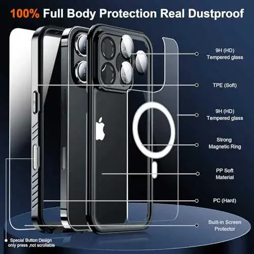 SPIDERCASE Magnetic for iPhone 16 Pro g'ilofi telefoningizni suv, zarba, chang va kundalik hayot qiyinchiliklaridan himoya qiluvchi to'liq himoya qiluvchi g'ilofdir. IP68 suv o'tkazmaslik sertifikati bilan 1,5 metr chuqurlikda 30 daqiqagacha suvga chidamli. Harbiy sinf zarbaga chidamlilik standartiga javob beradigan ushbu g'ilof 15 fut balandlikdan tushishdan himoya qiladi. O'rnatilgan ekran va kamera linzalari himoyachisi chizishlar va zarbalardan qo'shimcha himoya beradi. Shaffof orqa panel telefoningizning asl dizaynini ko'rsatadi, magnit xususiyati esa MagSafe aksessuarlari bilan moslikni ta'minlaydi. Aniq kesmalar barcha portlar, tugmalar va kameraga oson kirish imkonini beradi. Yumshoq va sezgir tugmalar mukammal teginish hissi beradi. Maxsus yangilash materiali toza ovoz sifatini saqlaydi va simsiz zaryadlash bilan mos keladi. SPIDERCASE Magnetic for iPhone 16 Pro g'ilofi telefoningizni har qanday sharoitda xavfsiz saqlash uchun ajoyib tanlovdir. Plyajda, basseynda, tog'da yoki kundalik hayotingizda telefoningiz xavfsizligi haqida tashvishlanishingizga hojat yo'q. Yuviladigan dizayni tufayli uni osongina tozalash mumkin va telefoningiz har doim toza va yangi ko'rinishini ta'minlaydi. G'ilofni o'rnatishdan oldin, mavjud ekran himoyachisi va kamera himoyachilarini olib tashlashingiz kerak, aks holda g'ilofning to'liq o'rnatilishiga ta'sir qilishi mumkin. Zaryadlash porti qopqog'ini ochib, yaxshiroq suhbatlar qilishingiz va ovoz sifatidan voz kechmasdan musiqa tinglashingiz mumkin. SPIDERCASE o'z mahsulotiga ishonadi va biron bir muammoga duch kelsangiz, Amazon xabarlar markazi orqali bog'lanishingizni so'raydi. Ular har doim qoniqarli yechimlarni taklif qilishga sodiqdirlar.