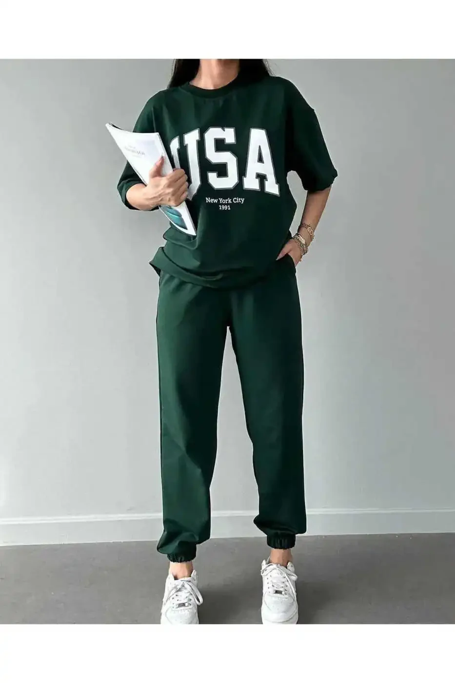 Футболка Usa и спортивные штаны Jogger - Зеленый печатный костюм из трикотажа сверху и снизу, свободного кроя, с круглым вырезом