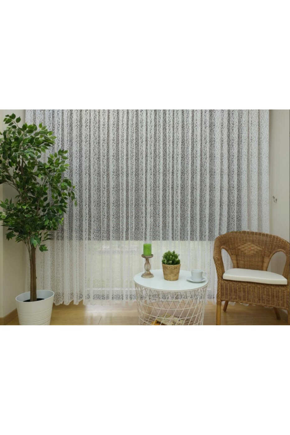 The elegant texture of French lace voile fabric and the modern lines of the sports pattern give the curtains a unique aesthetic. With its pleated structure, the curtains gain a fuller and more impressive look, while the 1/3 size elegantly adorns your window.