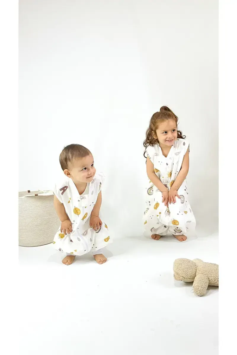 A double-layered, sleeveless sleeping bag made from organic cotton muslin, ensuring your baby sleeps comfortably and peacefully in the spring months. Its lightweight and breathable fabric keeps your baby cool and comfortable throughout the night. Muslin fabric is gentle on your baby's delicate skin due to its softness and breathability. The double-layered structure ensures that your baby stays warm. The sleeveless design allows your baby's arms to be free and makes it easier for them to move. It's also a practical product that's easy to put on and take off.