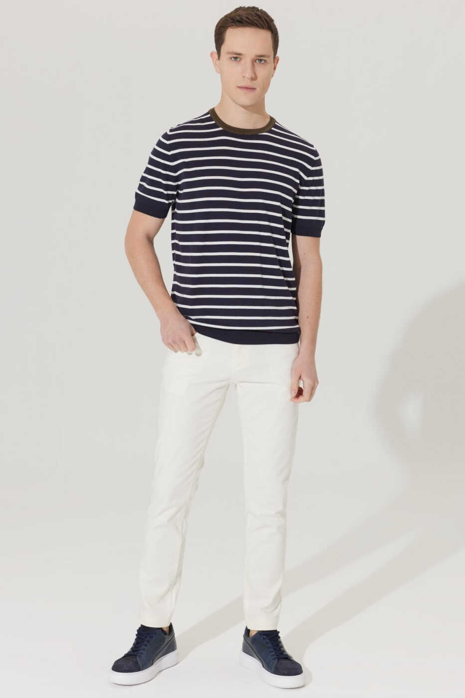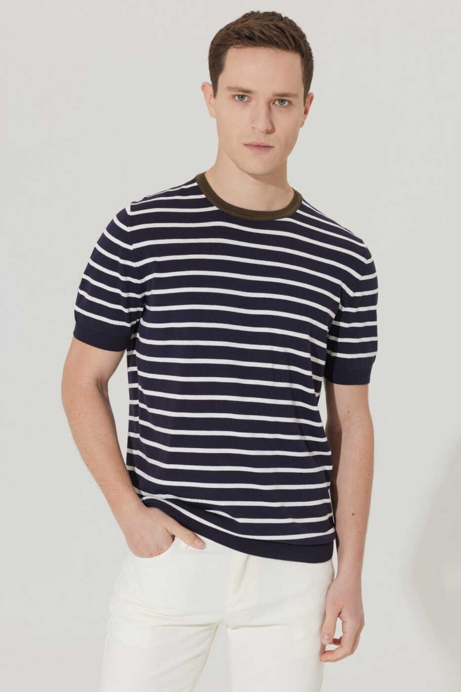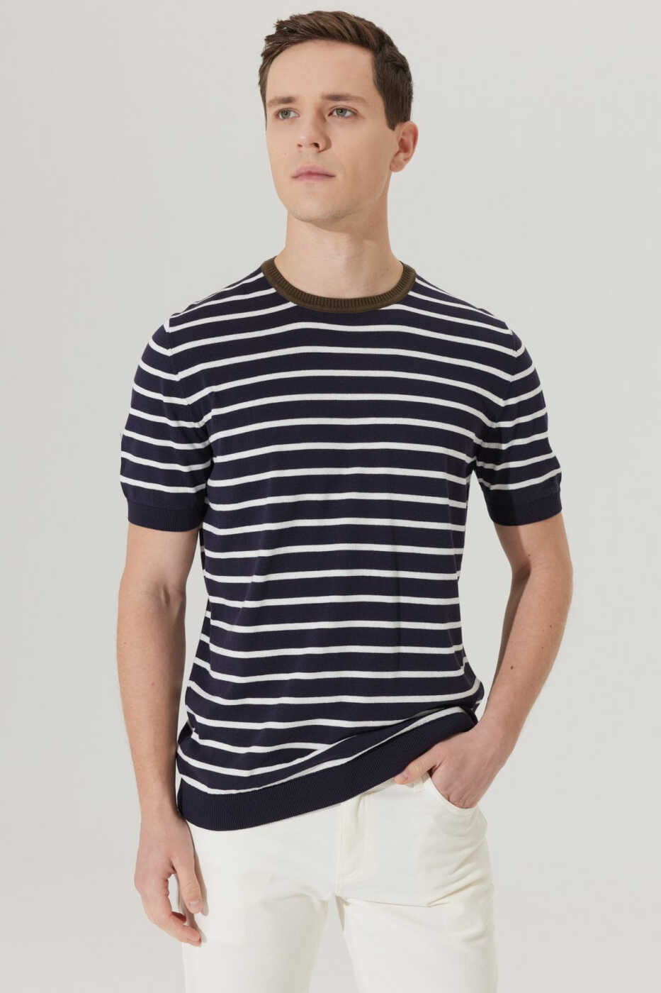 Knitted T-shirt, striped T-shirt, cotton T-shirt, crew neck, standard fit, navy blue white, Altınyıldız Classics, men's T-shirt, short sleeve, summer T-shirt