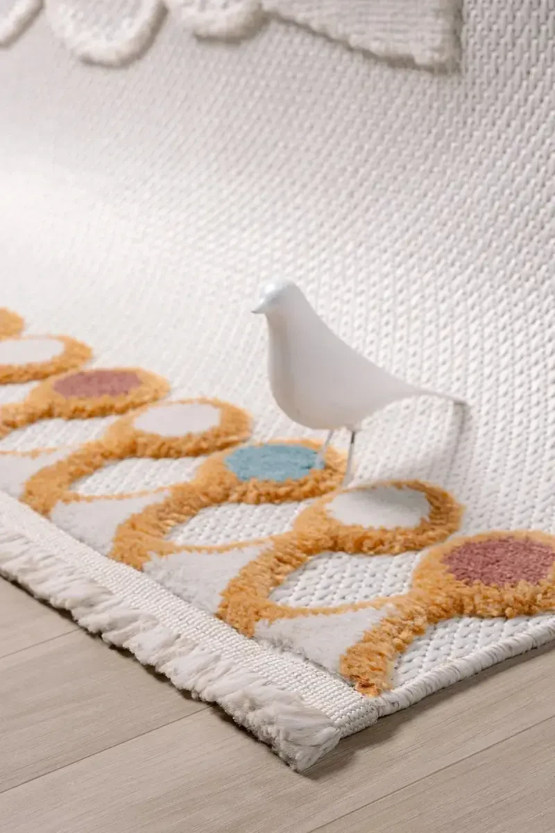 Моющийся ковер для детской комнаты с рисунком кролика, грязеотталкивающий, антибактериальный, антиаллергенный AYAZ 08-KREM 4 – это милый и функциональный ковер, специально разработанный для детских комнат. Этот ковер создает теплую и безопасную поверхность, где дети могут играть, а также придает комнате стильный вид. Кремовый цвет и милые рисунки кроликов обогащают мир воображения детей и привносят в их комнаты радостную атмосферу. Благодаря своим грязеотталкивающим, антибактериальным и антиаллергенным свойствам, он обеспечивает гигиеничную среду и защищает здоровье детей.**Описание продукта**Моющийся ковер для детской комнаты с рисунком кролика, грязеотталкивающий, антибактериальный, антиаллергенный AYAZ 08-KREM 4 – идеальный вариант для детских комнат. Этот ковер специально разработан с учетом нежной кожи детей. Поверхность ковра имеет мягкую и удобную текстуру, поэтому дети могут комфортно играть, ползать и проводить время на нем. Милые рисунки кроликов привлекают внимание детей и добавляют в их комнаты веселую атмосферу. Кремовый цвет позволяет ковру легко вписаться в любой интерьер комнаты. Одной из важнейших особенностей этого ковра является то, что его можно стирать. Учитывая, что дети часто пачкают ковры, эта особенность обеспечивает большое удобство. Ковер можно легко стирать и чистить в стиральной машине. Благодаря грязеотталкивающим свойствам, пролитые на ковер жидкости или остатки пищи легко удаляются, что помогает ковру всегда оставаться чистым и гигиеничным. Антибактериальные свойства предотвращают рост бактерий и микробов на ковре, тем самым защищая здоровье детей. Антиаллергенные свойства предотвращают скопление пыли и других аллергенов, которые могут вызывать аллергические реакции, на ковре. Эти свойства особенно важны для детей, страдающих аллергией или астмой. Ковер AYAZ 08-KREM 4 изготовлен из высококачественных материалов и имеет длительный срок службы. Прочная конструкция ковра обеспечивает его устойчивость к интенсивному использованию. Благодаря нескользящему основанию ковер остается неподвижным на полу и предотвращает скольжение детей. При выборе ковра для детской комнаты важно учитывать как эстетический вид, так и функциональные характеристики. Этот ковер сочетает в себе обе эти характеристики, что делает его отличным выбором для детских комнат. Вы можете выбрать этот ковер, чтобы создать веселую игровую площадку в комнате ваших детей и обеспечить здоровую и гигиеничную среду.**Характеристики продукта*** Возможность стирки* Грязеотталкивающая поверхность* Антибактериальный материал* Антиаллергенная структура* Милые рисунки кроликов* Мягкая и удобная текстура* Кремовый цвет* Нескользящее основание* Материалы, подходящие для здоровья детей* Легко чистится* Прочный и долговечный* Можно стирать в стиральной машине* Гипоаллергенный* Не собирает пыль и грязь* Подходит для декора комнаты**Дополнительная информация**Наш продукт не содержит вредных для здоровья детей веществ. Имеет сертификат OEKO-TEX® Standard 100. Размеры и вес ковра указаны в характеристиках продукта. Соблюдение инструкций по эксплуатации продлит срок службы ковра. Ковер отправляется в вакуумной упаковке. После вскрытия упаковки рекомендуется подождать некоторое время, чтобы ковер полностью принял свою форму. Оттенок цвета изделия