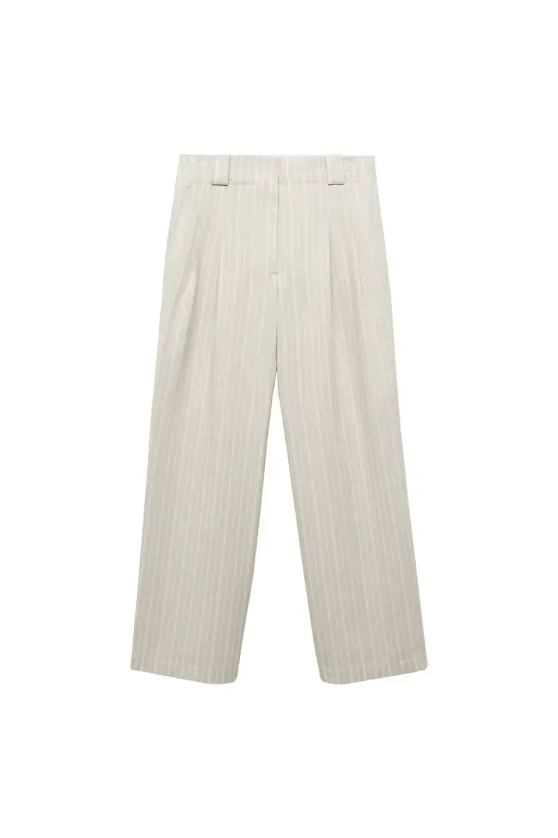 These stylish and comfortable straight cut striped pants are made from a blend of 41% linen, 34% cotton, 24% polyester, and 1% elastane. They feature a regular waistline and a hidden button, hook, and zipper closure for ease of wear. Two side pockets and belt loops are also included. The pleat detailing and lined construction add a touch of sophistication. The 100% cotton lining ensures a comfortable fit.