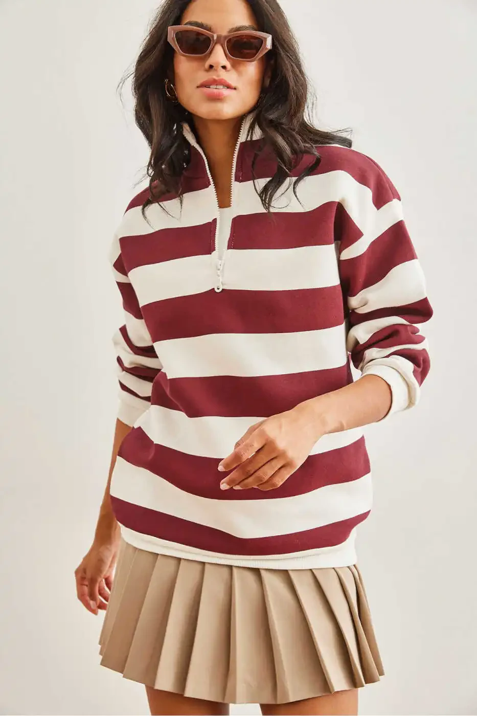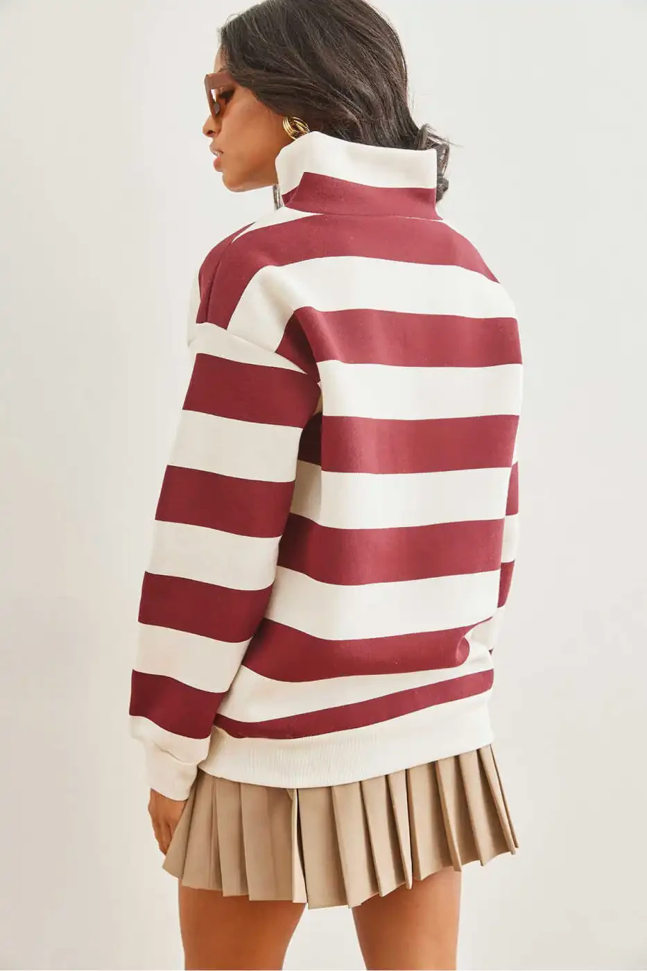 Women Sweatshirt, Striped Sweatshirt, Burgundy Sweatshirt, Zip-up Sweatshirt, High Neck Sweatshirt, Thistle Sweatshirt, Thick Sweatshirt, Trendyol, Olalook