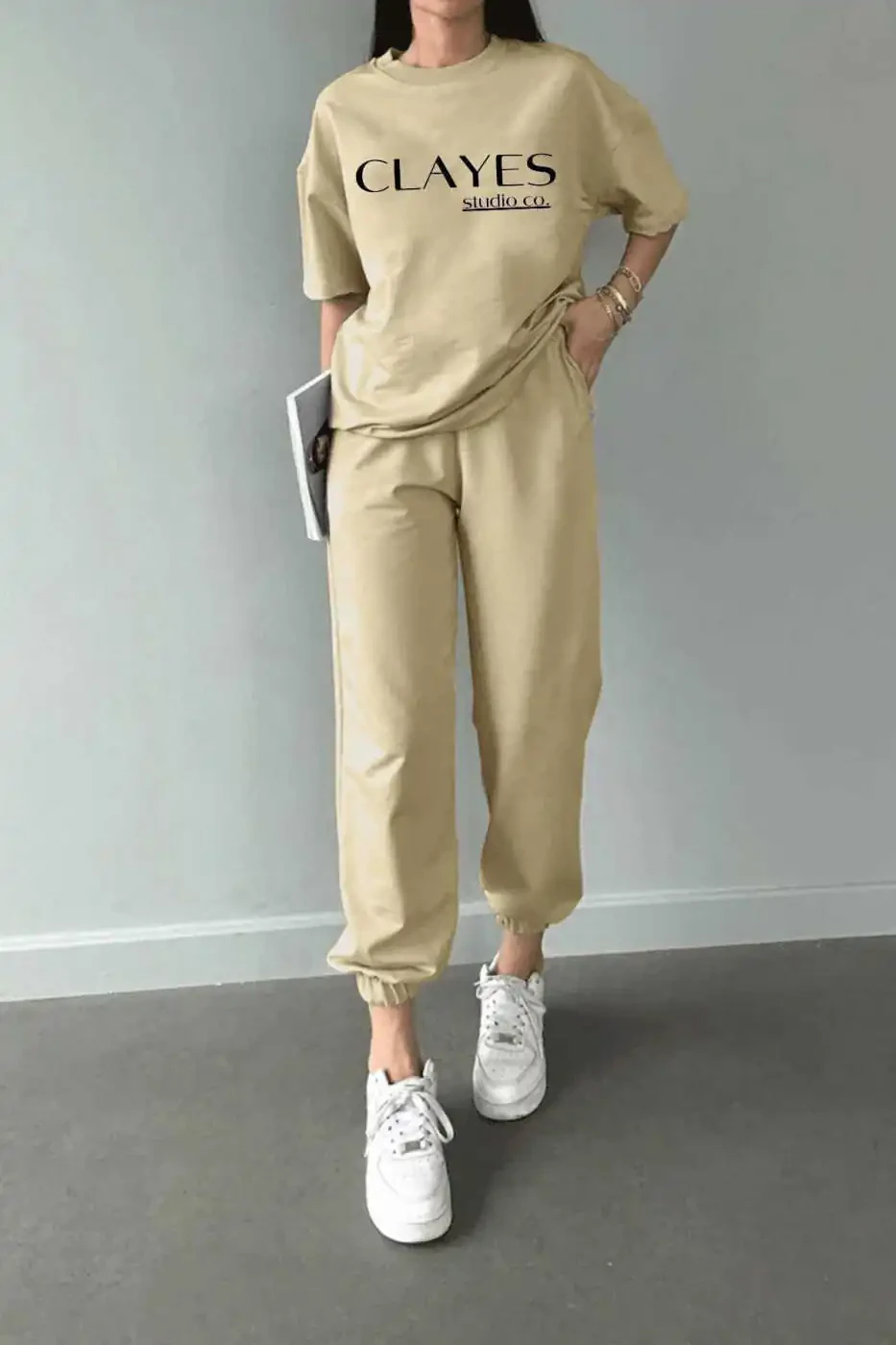 Studio Co Baskılı Bej T-shirt Eşofman Altı Takım ile her an rahat ve şık olun!