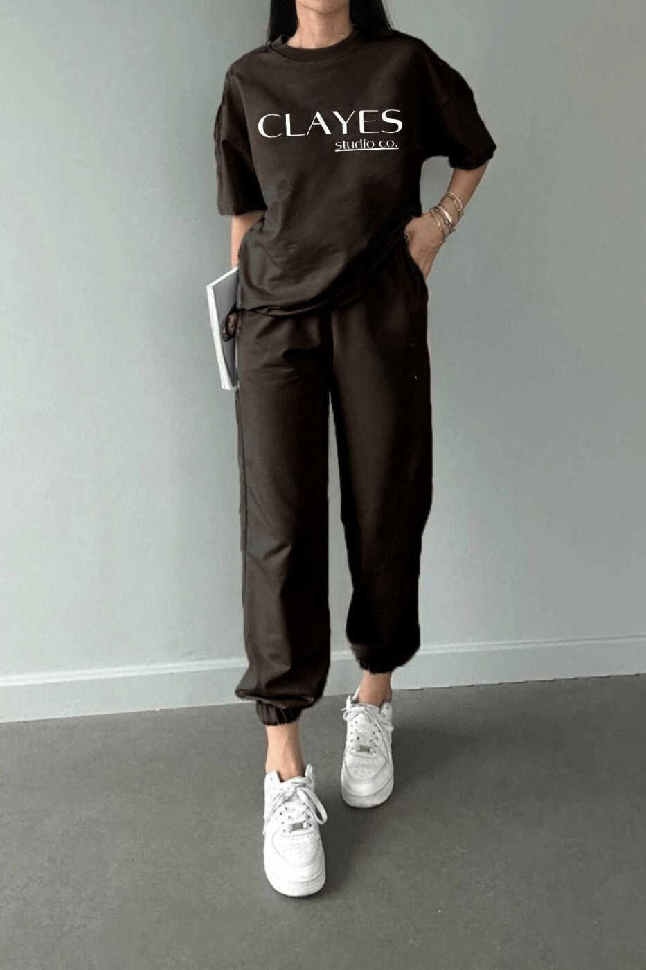 Studio Co Bosib Chiqarilgan Jigarrang Futbolka va Shim To'plami kundalik kiyim-kechak, sport, uyda dam olish yoki do'stlaringiz bilan uchrashish uchun ideal tanlovdir.