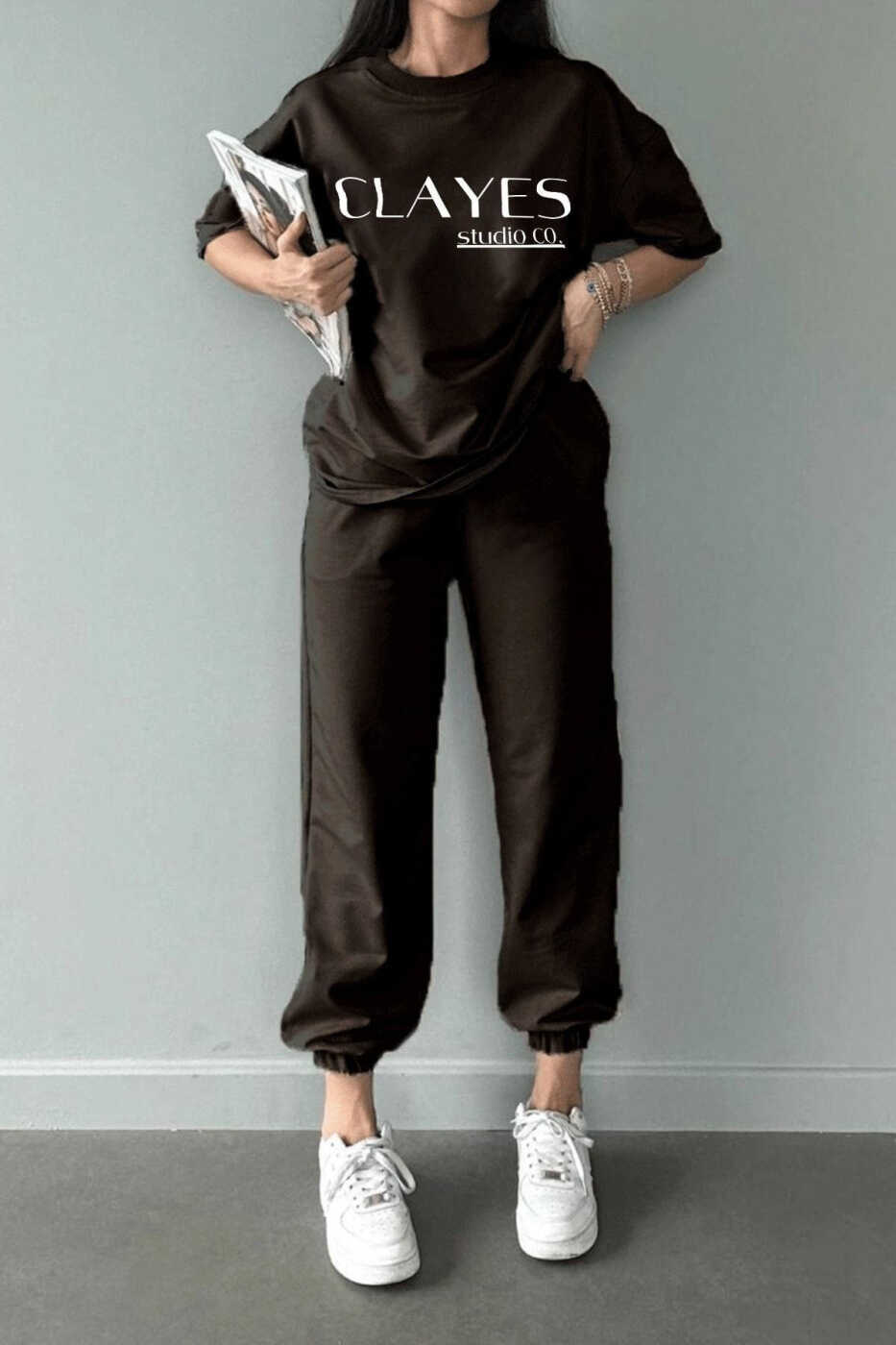 Check out this oversized crew neck t-shirt and sweatpants set from Studio Co, which offers both style and comfort. The brown color complements any style and helps you achieve a chic and comfortable look in your daily life.