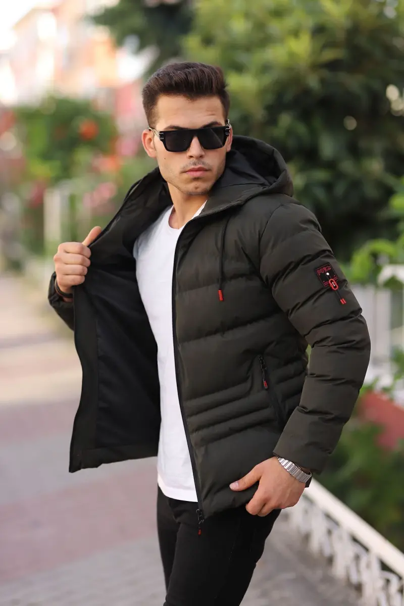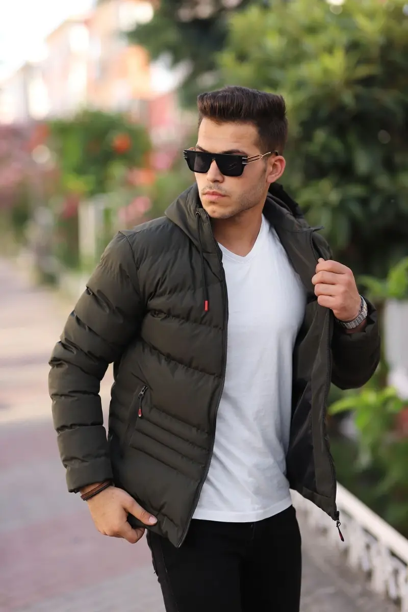 Su Ve Rüzgar Geçirmez Erkek Kapüsonlu Kışlık Mont Şişme Mont-haki