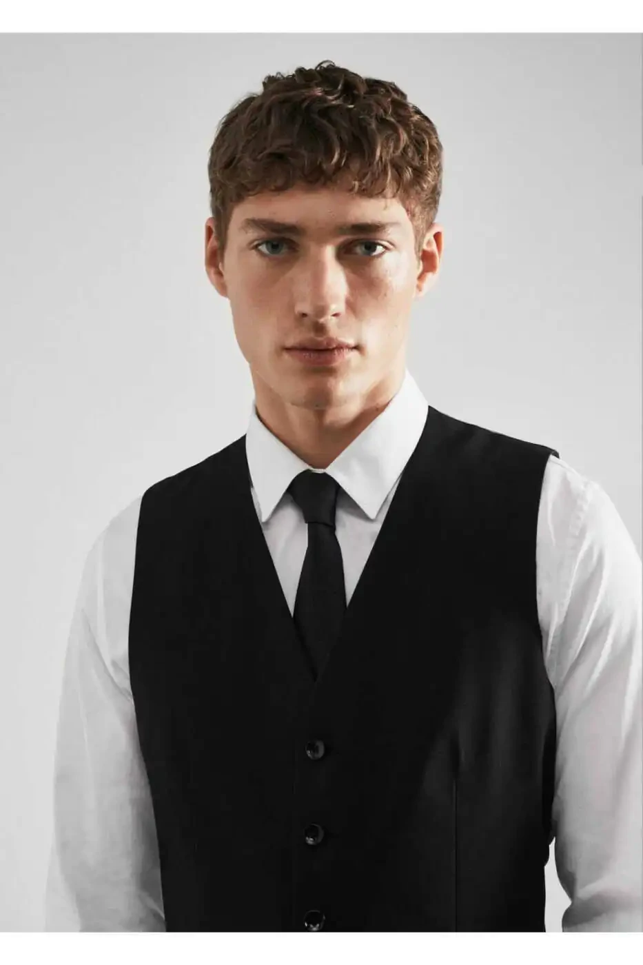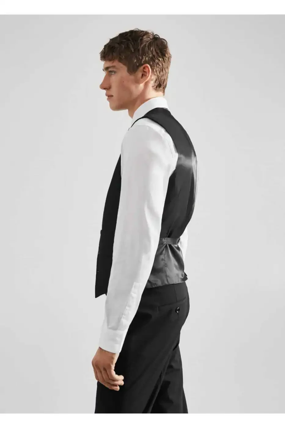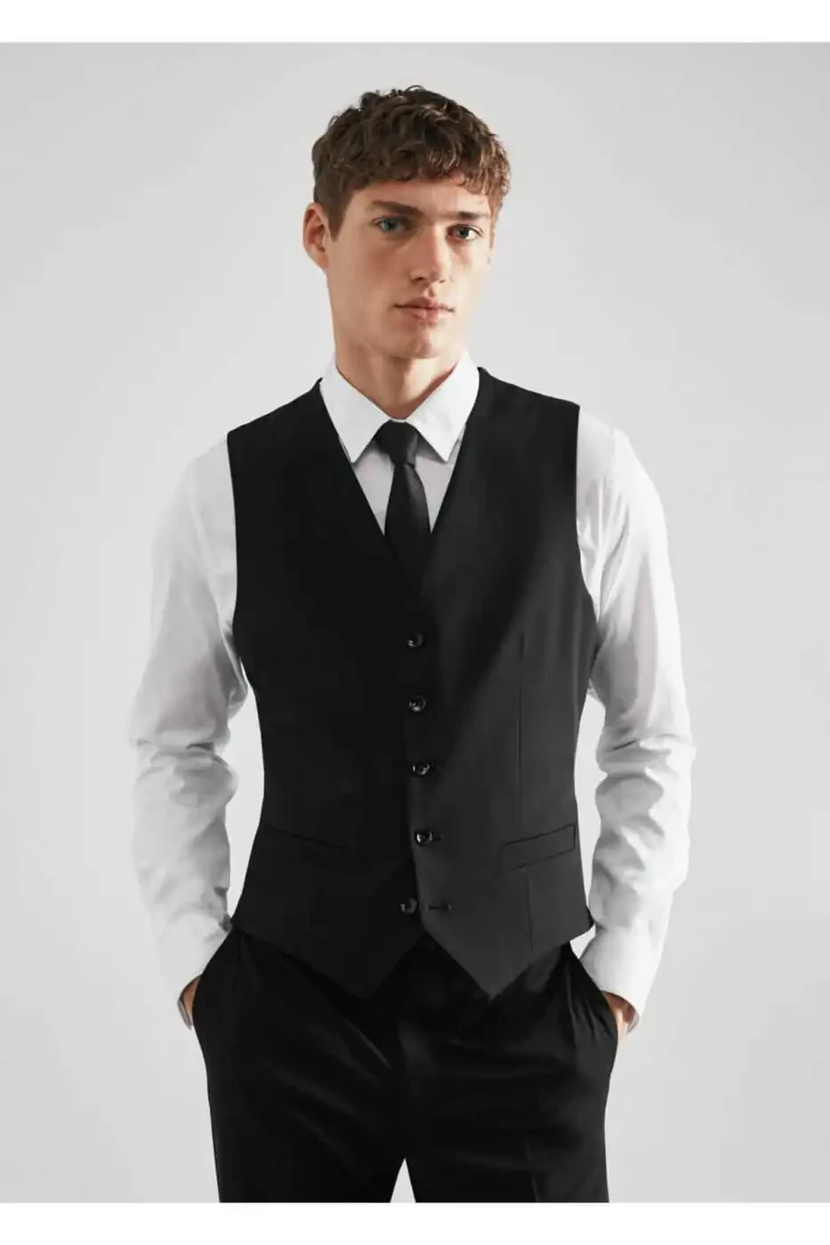 This stylish Super Slim Fit Vest will be an eye-catching addition to your wardrobe. It features a Medium design, V-neckline, sleeveless construction, and a two-welt pocket front. Button-front and adjustable buckle details add both convenience and sophistication. It's fully lined and has an interior pocket. The model is 183 cm tall and wears a size M.