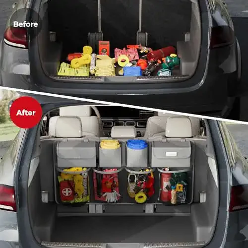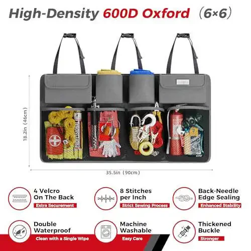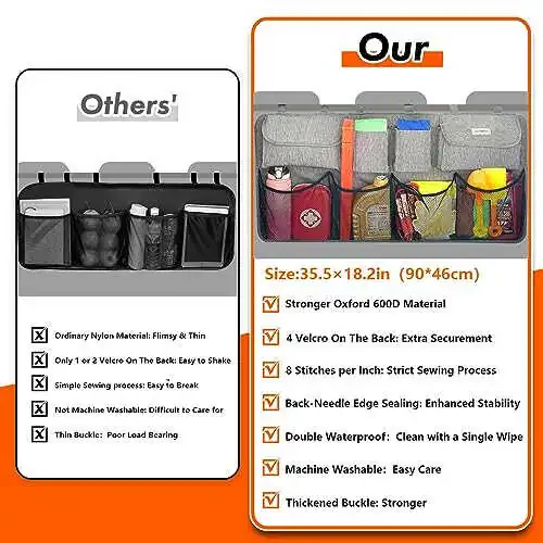 CONTINUOUS UPGRADES – SURDOCA car trunk organizer is constantly being improved. Thicker and heavier 600D Oxford fabric, ensuring superior load-bearing capacity and rigidity. Upgraded stitching techniques provide added strength and tear resistance. Easier installation, rock-solid stability. 30% increased capacity to carry even more. These are just a few of the many upgrades UNMATCHED QUALITY – We take pride in using high-density 600D Oxford fabric with a 6x6 weave. Compared to traditional polyester materials, Oxford fabric offers superior durability, tear resistance, and excellent waterproofing. Our product's density is twice than most trunk organizer on the market. At 1.1 pounds, it's heavier for a reason – to withstand heavier loads STRICT SEWING PROCESS – Every inch is sewn with 8 stitches, using camping backpack-level stitching techniques. Using 5.5g thread, stronger than the general threads used in most car organization. The Back-Needle Edge Sealing reinforces pockets and straps, significantly increasing tear resistance and extending the product's lifespan by 1-2 years EFFORTLESS INSTALLATION – Installing our cargo organizer takes less than 3 minutes. 4 pcs of non-slip strips on the back ensure a secure fit against the back seats, preventing any unwanted movement. Plus, it doesn't take up any extra space. With eight different-sized pockets, it effectively doubles your trunk's storage capacity, keeping it neat and organized ABOUT SURDOCA BRAND – SURDOCA stands as a leader in the automotive storage solutions industry, driven by customer needs. We are committed to delivering the highest-quality products on the market. With over a million households choosing SURDOCA, our reputation speaks for itself. We are your trusted partner for a clutter-free and organized trunk space