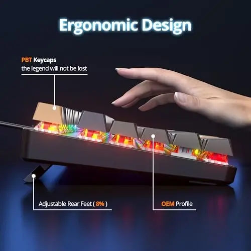 - Advanced Ergonomic Comfort: This PC gaming keyboard features a ladder-step keycap design that positions your arms naturally, reducing hand fatigue during long-term use. It includes two foldable rear support feet for an adjustable typing angle and four rubber pads for stability and non-slip performance.