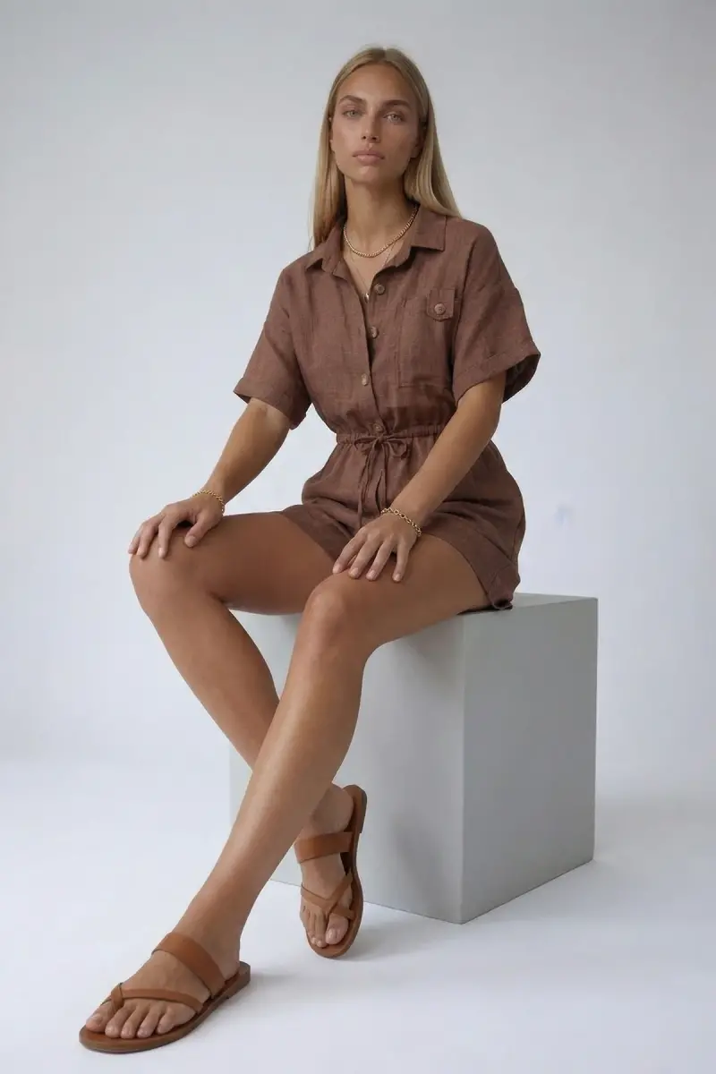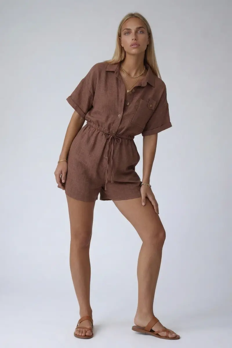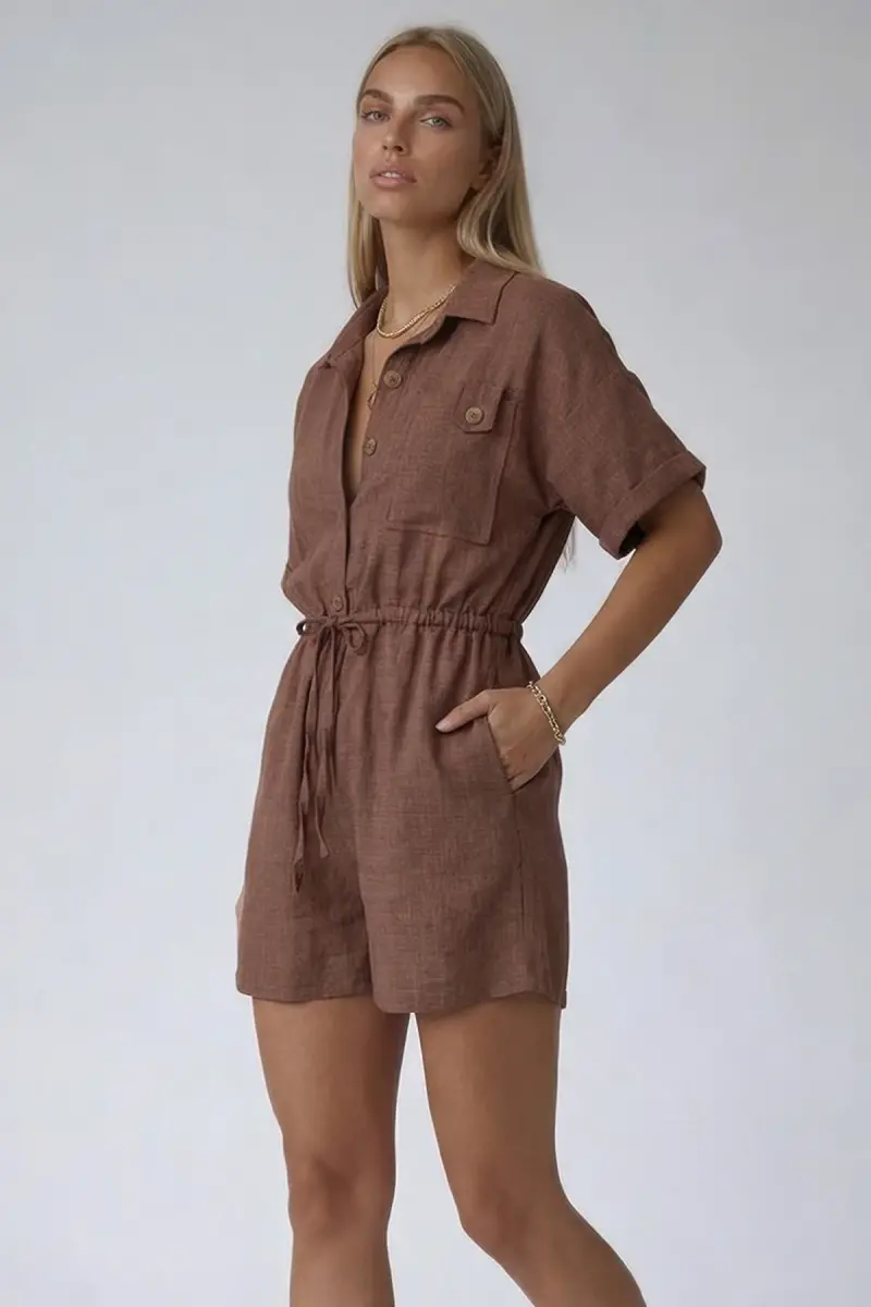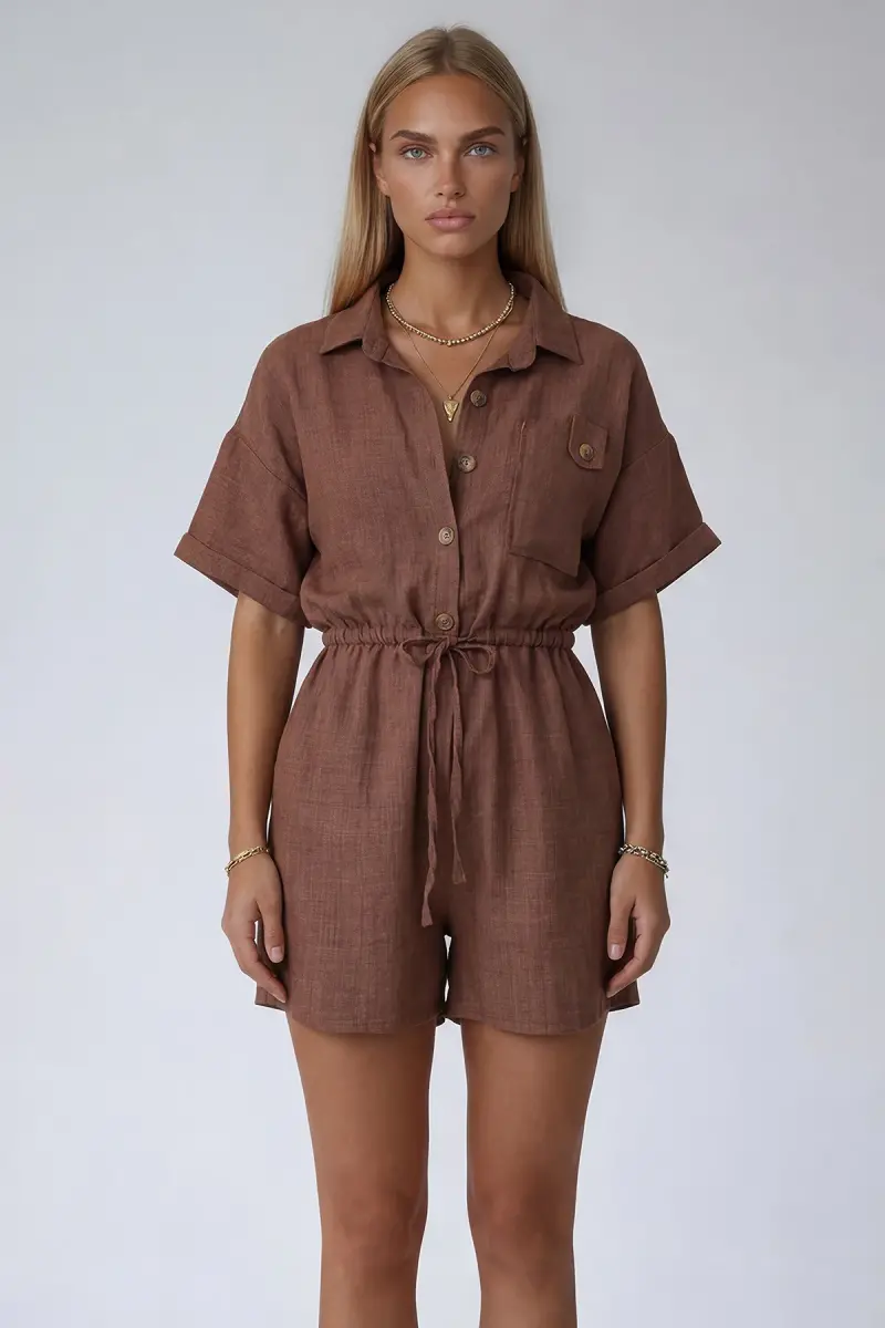 Sütlü Kahve Gömlek Yaka Çift Cepli Keten Şort Tulum-SÜTLÜ KAHVE