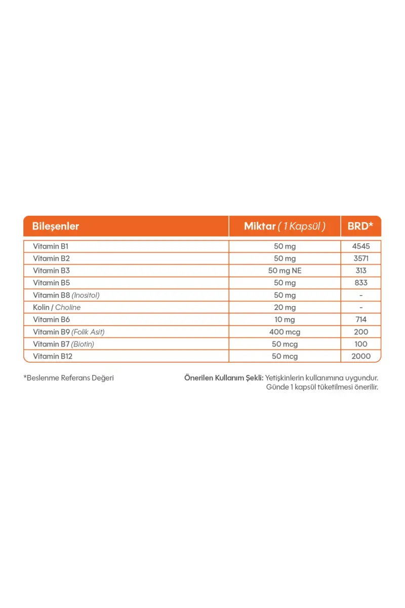 Suda Vıtamın B-50 Complex 60 K, 8 ta muhim B vitaminini (B1, B2, B3, B5, B6, B7, B9, B12) kunlik ehtiyojingizni qondirishga yordam berish uchun maxsus ishlab chiqilgan. Ushbu kompleks asab tizimi faoliyatini, energiya metabolizmini, hujayra o'sishi va rivojlanishini qo'llab-quvvatlashda muhim rol o'ynaydi.