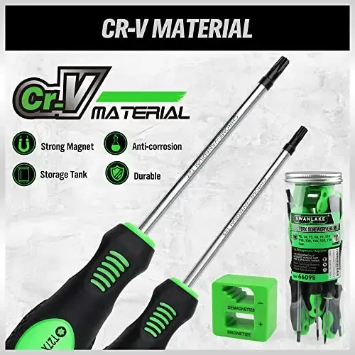 The SWANLAKE Magnetic Torx Screwdriver Set is an ideal choice for professional and home users. Thanks to its high quality materials and ergonomic design, you can use it safely for many years. The magnetic receiver in the set provides great convenience, especially when working in tight spaces. All screwdrivers are offered in a special box that is easy to carry and store.