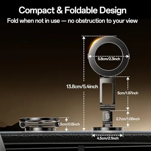 【360° Rotatable & Three-Axis Foldable Design for Ultimate Flexibility】 Enjoy complete flexibility with 360° rotation and a three-axis adjustable arm, allowing you to position your phone exactly how you want it, whether on your car dashboard, windshield, or desk. [Product Size: Fully Extended Height:13.8cm/5.4in, Completely Folded height:1.5cm/0.6in, Mounting Base Diameter:4.5cm/1.8in, Magnetic Ring Diameter:5.8cm/2.3in] 【Effortless Magnetic AttacModazoneent with MagSafe Technology】 MagSafe magnetic attacModazoneent makes mounting and unmounting your phone a breeze with one-hand operation in just one second—no more fumbling with traditional mounts. 【High-Quality Metal Craftsmanship】The Magnetic phone holder for car is crafted from high-hardness zinc alloy material, created through high-temperature casting and precision CNC machining. In comparison to plastic car mounts, they are sturdy, durable, and resistant to deformation. The surface adopts a matte electroplating process, providing a sophisticated metallic texture that is both aesthetically pleasing and long-lasting. 【Super Stable Design】The Syncwire MagSafe Car Phone Holder features 3 tightly fastened metal damping axles, which have undergone 12000 durability tests to prevent shaking and displacement during travel, providing optimal stability for your phone. 【Optimized Magnetic Strength with N55 Neodymium Magnets】The MagSafe 3 car mount stand utilizes powerful N55 neodymium magnets, showcasing precise adjustable magnetic force. This ensures a secure connection for your phone. 【Ring Vent Design】The magnetic mount features a ring vent design, directing cool air from the vent to help dissipate heat from the phone. It is also compatible with Pop Grips featuring MagSafe functionality, allowing direct use without removing the magnetic ring. 【Genuine 3M Adhesive】- It uses authentic 3M GPH-160 adhesive for enhanced stability. Even in extreme temperatures ranging from -40°F to +300°F, the magnetic car mount maintains adhesion, offering long-lasting stability, and includes spare adhesive pads for replacement. Press for 10 seconds and wait for 5 hours to strengthen adhesion. (IMPORTANT NOTICE: 3M adhesive tape is not suitable for application on interior surfaces like genuine leather, suede, and oil-coated fabrics. Avoid using it on these surfaces to prevent damage or poor adhesion.) 【Works for All Phones】- The car phone holder mount is compatible with iPhone 12-17 series or with any MagSafe-supported phone cases. It can also be used with the included magnetic sheet, affixed to the back of a regular phone case, making it suitable for use with all phones, including Apple, Samsung, HTC, Google, and more. ***Very Important***1. Rub vigorously and repeatedly at least 10 times. 2. Wait for about 15 seconds after wiping. Allow it to completely evaporate. 3.Press it firmly for 10 seconds when pasting, and let the adhesive set for a minimum of 5 hours before use. What You Get - SYNCWIRE Foldable MagSafe Car Mount for Car Dash x1, 3M Adhesive Pad x 1, Metal Ring x 2 (White & Black), User Guide x1, Warranty Card x 1, fast and friendly customer service within 24 hours to assist with any questions you may have.