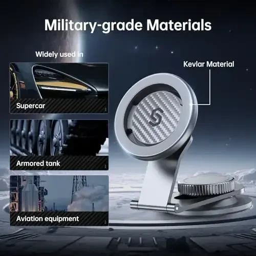 The SYNCWIRE Fits MagSafe car phone holder is specifically designed for universal dashboards and Tesla screens. The Kevlar silver magnetic phone holder is compatible with iPhone 17 Pro Max, 16, 15, 14, 13, 12 and all other phone models. This product aims to improve your driving experience by offering superior protection, sturdiness and ease of use. This magnetic car phone holder is made of high quality materials. The panel part is made of protective Kevlar material that combines lightweight design and exceptional durability. The Kevlar structure not only provides strength but also adds a stylish look to your vehicle's interior design. Please note that this product has magnetic properties but is not a charger. Thanks to MagSafe compatibility that meets industry standards, it can be easily attached and detached with a magnetic ring. The SYNCWIRE magnetic phone holder is made of ultra-high-strength steel aluminum alloy used in automobiles and offers optimum durability. The strong hinge-like vehicle frame mimics the rigidity of a car's chassis. Thanks to precise CNC machining and anodizing on the surface, it is both aesthetic and long-lasting. These features provide optimum stability for your phone. Thanks to its extra-wide 28 cm² adhesive area, the 3M VHB label offers 3 times more adhesion than other products and provides a more stable hold. It is less likely to damage the interior compared to traditional suction cup products. Because suction cups can cause irreversible deformations and damage to users' dashboards due to the vacuum effect. The original 3M GPH-160 adhesive used in the product retains its adhesion even in harsh environments between -40°F and +300°F. It offers long-lasting and stable adhesion. A spare of the same adhesive tape is included in the package. Please press for 10 seconds after pasting and wait 5 hours for the adhesion to strengthen. Thanks to the powerful N52 grade neodymium magnets, the MagSafe car phone holder offers precisely adjusted magnetic force. This ensures that your phone is held securely. The magnet force reaches up to 12N (1.2 kg) for the iPhone 13-15 series, 15N (1.5 kg) for MagSafe-enabled phone cases, and 25N (2.5 kg) for metal rings. For the iPhone 11-12 series, please use MagSafe cases or metal rings. Thanks to its 360° rotatable and foldable design, you can experience the best driving angle. The rotating ball joint design allows you to adjust your phone to the desired position. The holder base supports rotation and telescopic adjustment. By removing the button, it can be converted into front and rear shapes or attached to the back of the Tesla screen. The foldable design allows you to hide the phone holder. The magnetic bracket has a ring-shaped ventilation design that directs cold air from the air outlet and prevents the phone from overheating. This car phone holder is perfectly compatible with iPhone 16, 16 Plus, 16 Pro, 16 Pro Max, iPhone 15 Pro Max, 15 Plus, iPhone 14 Pro Max, iPhone 13 Pro Max, iPhone 12 Pro Max and 12 Mini. It is also compatible with official MagSafe cases and other magnetic phone cases. Compatible with other phone brands such as Samsung, Google and LG with the metal ring included in the package. The SYNCWIRE magnetic car phone holder is an ideal solution for keeping your phone safe and accessible while driving. It will meet your expectations thanks to its superior material quality, strong magnetic structure and versatile design.