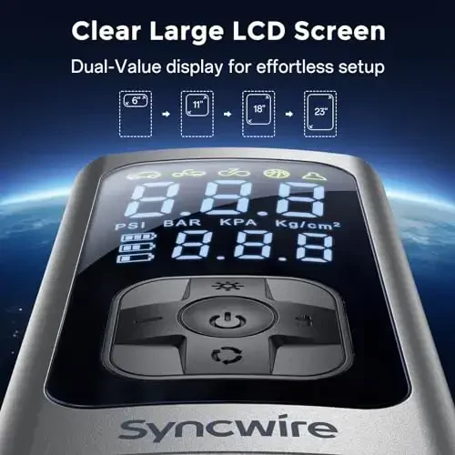 Syncwire Tire Inflator Portable Air Compressor - bu sizning avtomobilingiz, mototsiklingiz, velosipedingiz va hatto to'plaringiz shinalarini tez va samarali ravishda shishirish uchun mo'ljallangan zamonaviy yechimdir. 150PSI gacha bo'lgan bosim quvvati bilan ushbu aqlli havo nasosi shinalaringizni bir necha daqiqada shishiradi va vaqt va energiyangizni tejaydi. Bundan tashqari, mahsulot bilan birga keladigan Asurion himoya rejasi tufayli siz xaridingiz sanasidan boshlab nosozliklar, yiqilishlar, suyuqlik to'kilishi va ekran singanligi kabi holatlardan himoyalangan bo'lasiz. Ishlab chiqaruvchi kafolati tugagandan keyin ham, buzilishlar haqida tashvishlanishingizga hojat yo'q. Syncwire havo nasosi shunchaki mahsulot emas, balki kafolat paketidir. Ushbu ko'chma havo kompressori ajoyib ishlash va foydalanish qulayligini birlashtiradi. Boshqa shunga o'xshash mahsulotlarga qaraganda 2 barobar tezroq inflyatsiya xususiyati tufayli siz shinalaringizni qisqa vaqt ichida ideal bosimga keltirishingiz mumkin. ixcham dizayni, smartfon kabi kichik bo'lganligi uni istalgan joyga olib borishni osonlashtiradi. U avtomobilingizda, velosipedingizda yoki sport anjomlaringizda foydalanasizmi, Syncwire havo nasosi har doim siz bilan bo'lishga tayyor. Mahsulotning eng diqqatga sazovor xususiyatlaridan biri bu o'ta keng LCD displeydir. Ushbu displey bir vaqtning o'zida real vaqt bosimi va oldindan belgilangan maqsadli bosimni ko'rsatib, inflyatsiya jarayonini aniq nazorat qilish imkonini beradi. Ekran kattaligi, kunduzi yoki kechasi bo'lishidan qat'i nazar, barcha qiymatlarni osongina o'qish imkonini beradi. Bir tugmali oson sozlash xususiyati yordamida siz avtomobil, mototsikl, velosiped yoki to'p uchun oldindan belgilangan rejimlardan birini tanlashingiz yoki maxsus rejimni o'rnatishingiz mumkin. Bundan tashqari, siz bosim birligini (PSI, KPA, BAR, KG/CM²) osongina o'zgartirishingiz mumkin. Syncwire havo nasosi nafaqat o'zining ishlashi, balki taklif qiladigan qo'shimchalar bilan ham ajralib turadi. Mahsulot bilan birga keladigan alyuminiy qotishma shinalari supap qopqoqlari avtomobilingiz shinalariga zamonaviy teginish qo'shadi, shuningdek, yo'qolgan taqdirda mukammal zaxira qism vazifasini bajaradi. Bundan tashqari, mahsulot bilan birga berilgan saqlash sumkasi barcha aksessuarlarni tartibli ravishda saqlash va havo nasosini osongina tashish imkonini beradi. Xulosa qilib aytganda, Syncwire Tire Inflator Portable Air Compressor - bu portativlik, tezlik, aniqlik va foydalanish qulayligini qidiradigan har bir kishi uchun ideal yechimdir.