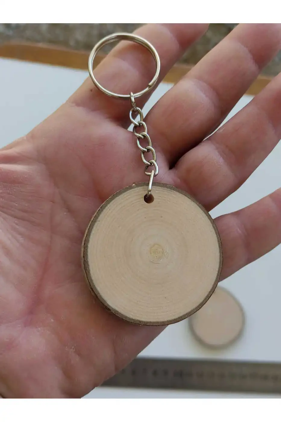 Tabiiy yog'och kütük dilimlaridan tayyorlangan, bo'yaluvchi va shaxsiylashtirilgan sovg'a kalitliklar. 4-5 sm o'lchamda, 50 dona to'plamda, har biri noyob tabiiy to'qimaga ega.