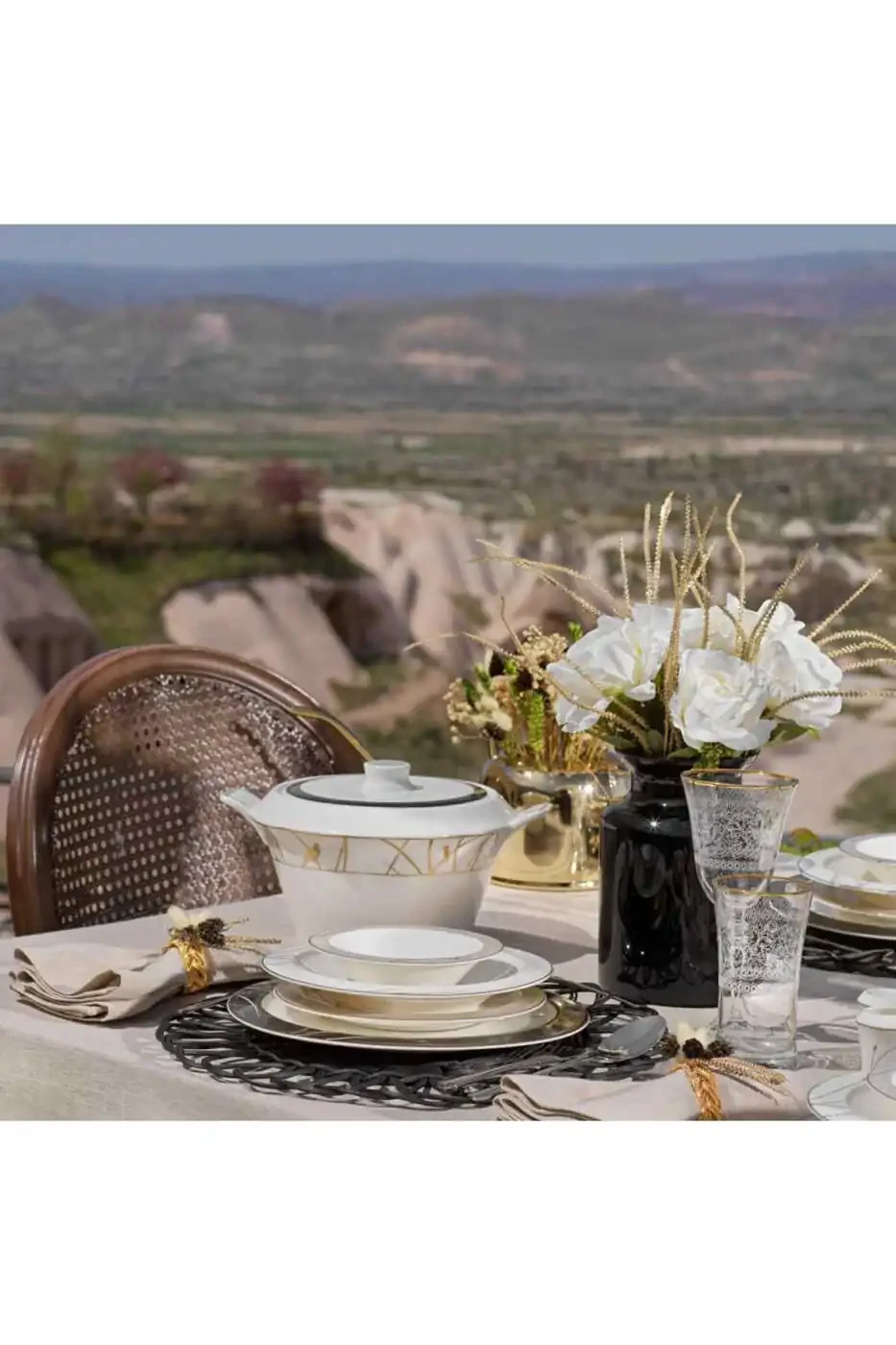 This magnificent set contains 60 pieces, each offering unique elegance. With 12 dinner plates, 12 soup plates, 12 dessert plates, 12 tea plates, 12 coffee cups and 12 water glasses, you will always have a complete set on your tables.