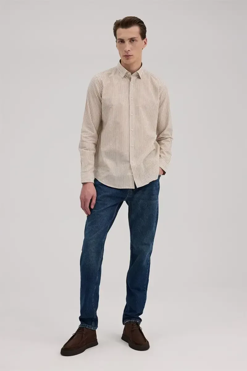 Tan Comfort Fit Linen Blend Striped Shirt is an ideal choice for men who do not want to compromise on elegance in hot weather. The natural texture of linen and the softness of cotton come together to offer all-day comfort. The shirt's comfortable fit allows you to achieve a stylish look without restricting your freedom of movement. Its classic striped pattern easily adapts to both your everyday combinations and your style for more special occasions.Product DescriptionTan Comfort Fit Linen Blend Striped Shirt is a candidate to be an indispensable part of your wardrobe. Its linen blend fabric, which keeps you cool and fresh on hot summer days, offers a comfortable wearing experience all day long. The shirt's modern and stylish striped pattern creates a timeless look that can adapt to any environment. Whether you wear it at a business meeting, a weekend getaway, or a special occasion, it always allows you to reflect your style. The comfort fit cut creates a comfortable silhouette without constricting your body. The shirt's buttons are made of high-quality material and provide long-lasting use. The tan color can be easily combined with many different colors, allowing you to create different styles. You can complete your shirt with chino pants, jeans, or shorts to create stylish combinations suitable for any situation. The breathable structure of the linen blend fabric helps prevent sweating and keeps you fresh all day long. The shirt's light and thin texture makes it an ideal choice, especially in hot weather. The shirt's collar is designed as a classic shirt collar and can also be used with a tie or bow tie. The shirt's cuffs are buttoned and can be folded for a more sporty look. Tan Comfort Fit Linen Blend Striped Shirt is a perfect option for men who are looking for both elegance and comfort. This shirt will be one of the basic pieces of your wardrobe and will accompany you for many years. The shirt's easy-to-iron feature saves you time and ensures you always look well-groomed. Thanks to its machine washable feature, cleaning is also very practical. Reflect your style with the Tan Comfort Fit Linen Blend Striped Shirt and attract attention in any environment.Product Features* Linen blend fabric* Comfort fit cut* Striped pattern* Tan color* Buttoned cuffsAdditional InformationTo ensure the product's long life, follow the washing instructions on the label. Wash the product with similar colors. Do not use bleach. Iron at low heat.