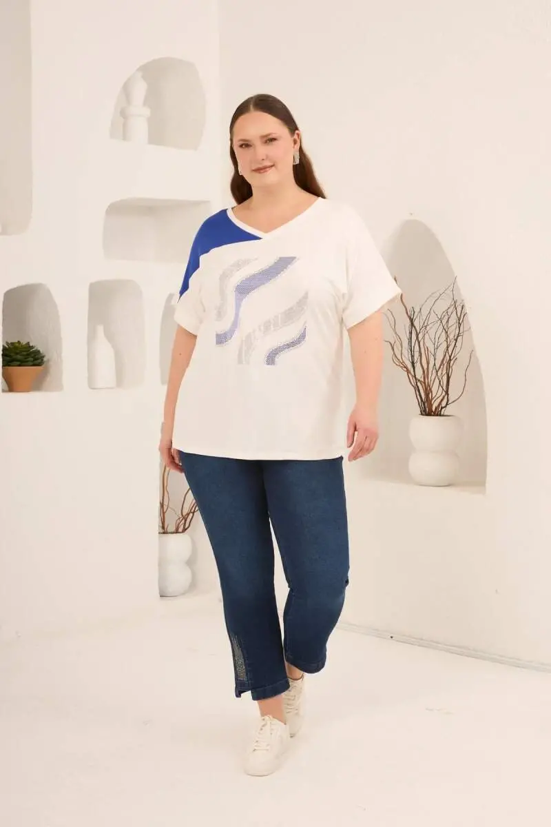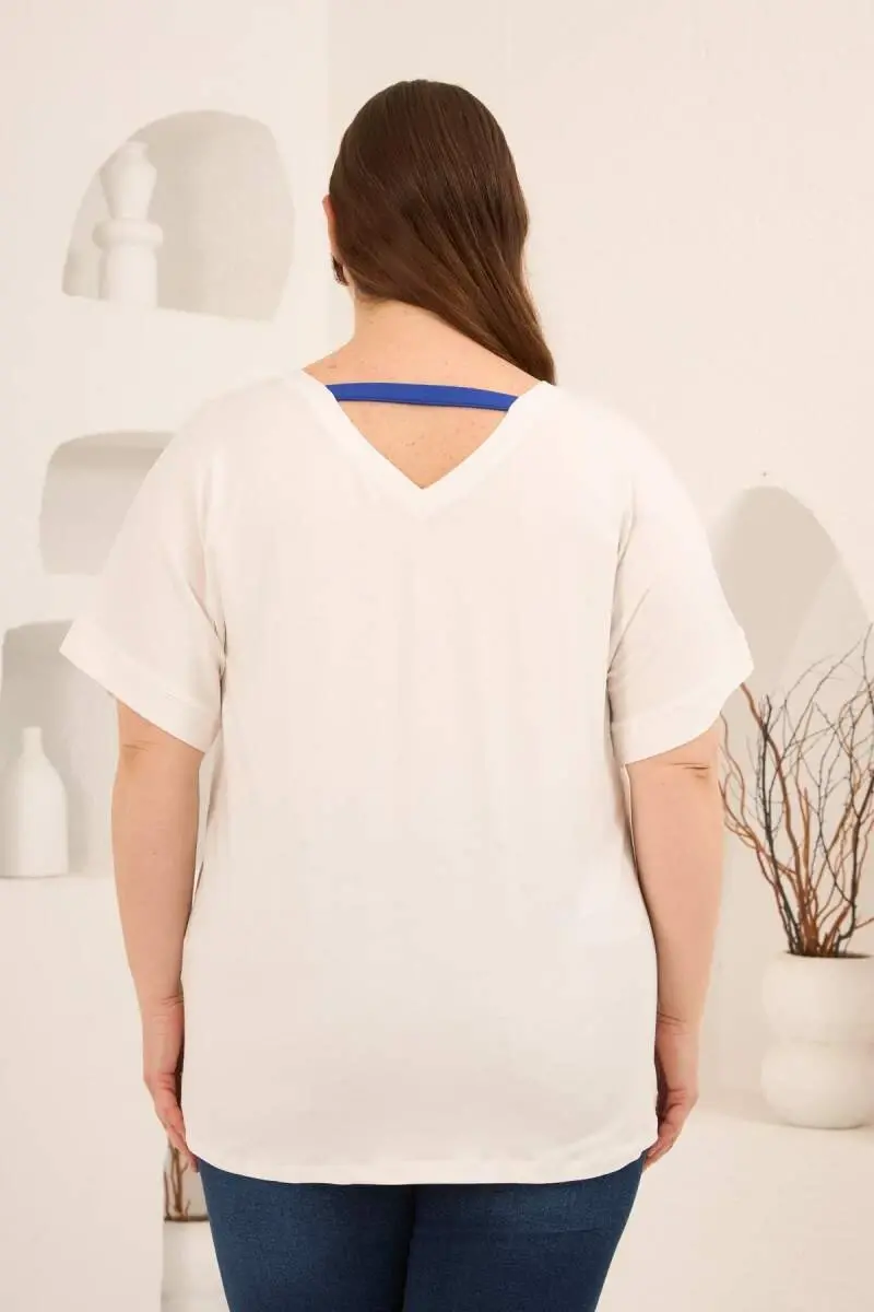 Taş Baskılı Büyük Beden Garnili Tişört Ekrusaks