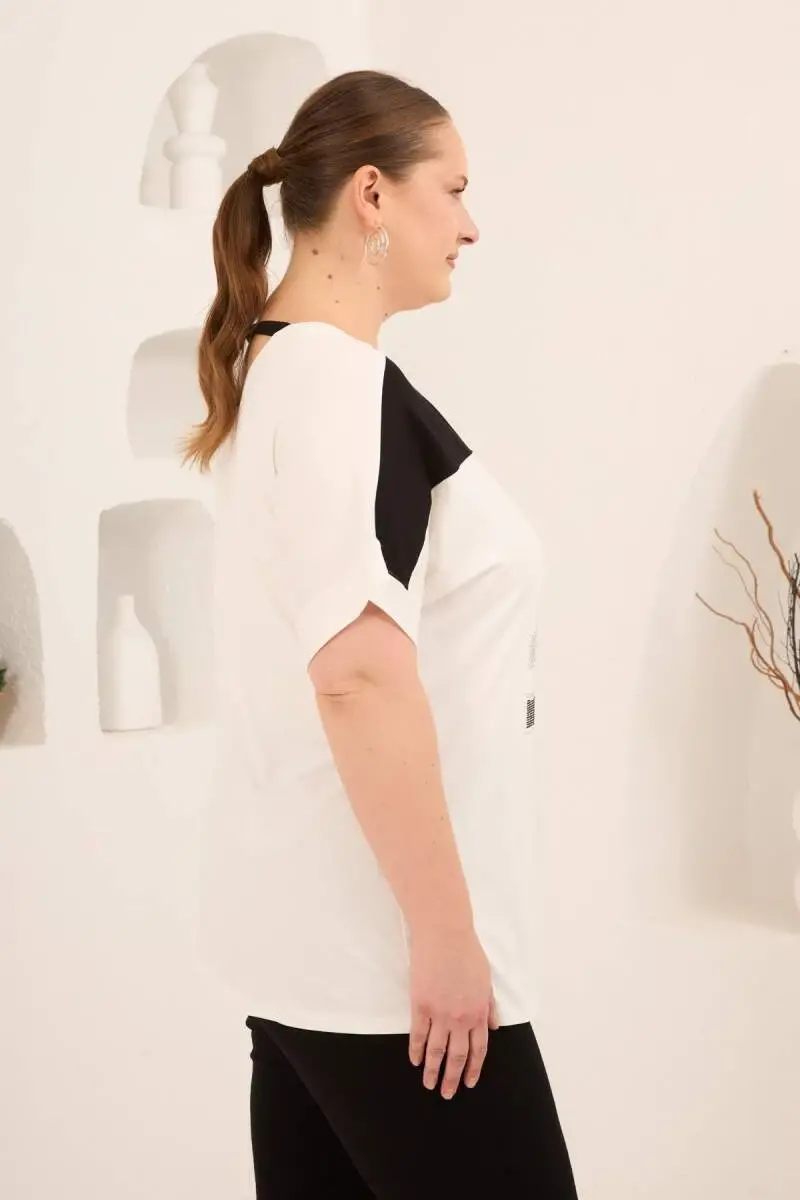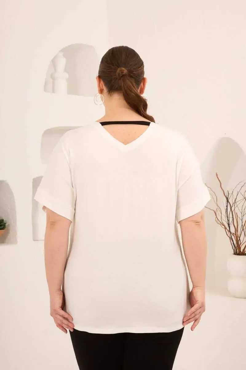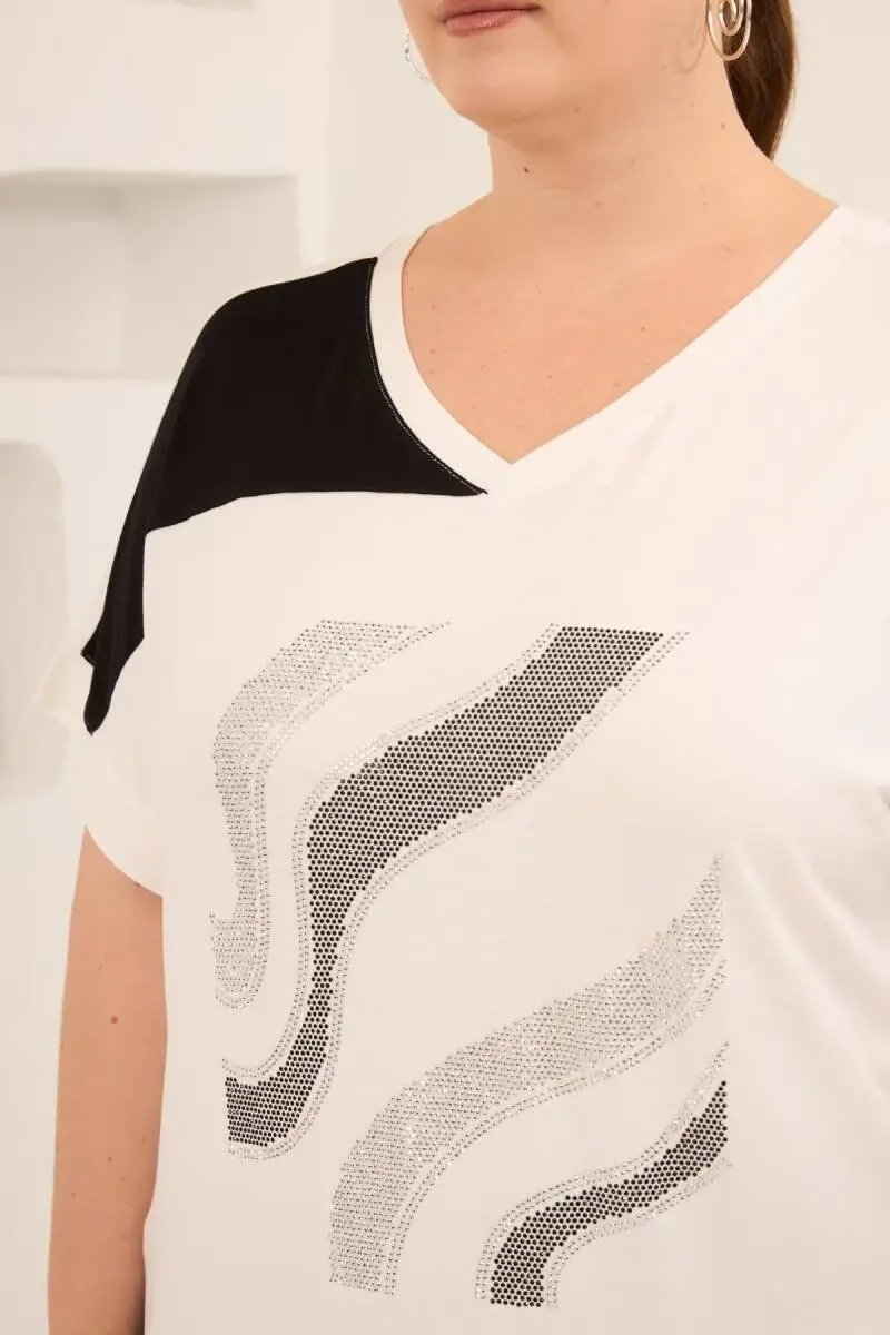Taş Baskılı Büyük Beden Garnili Tişört Ekrusiyah