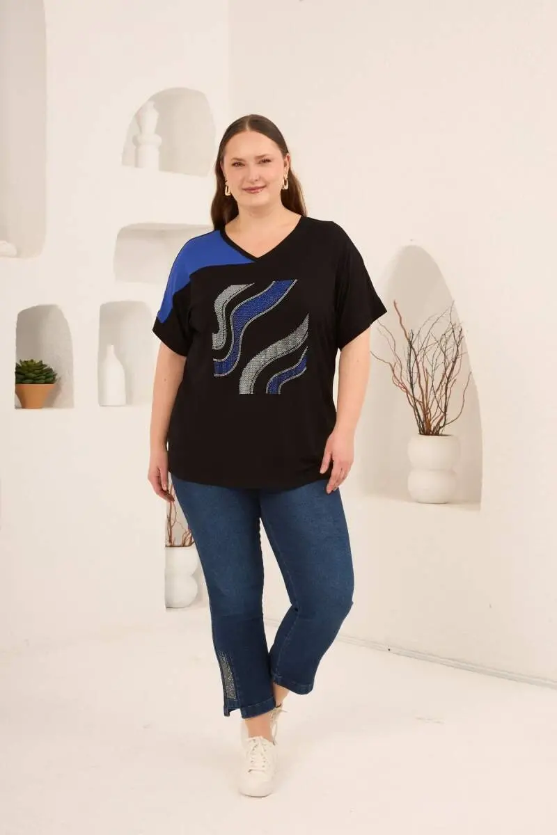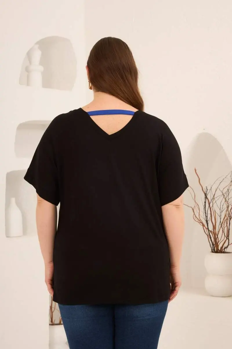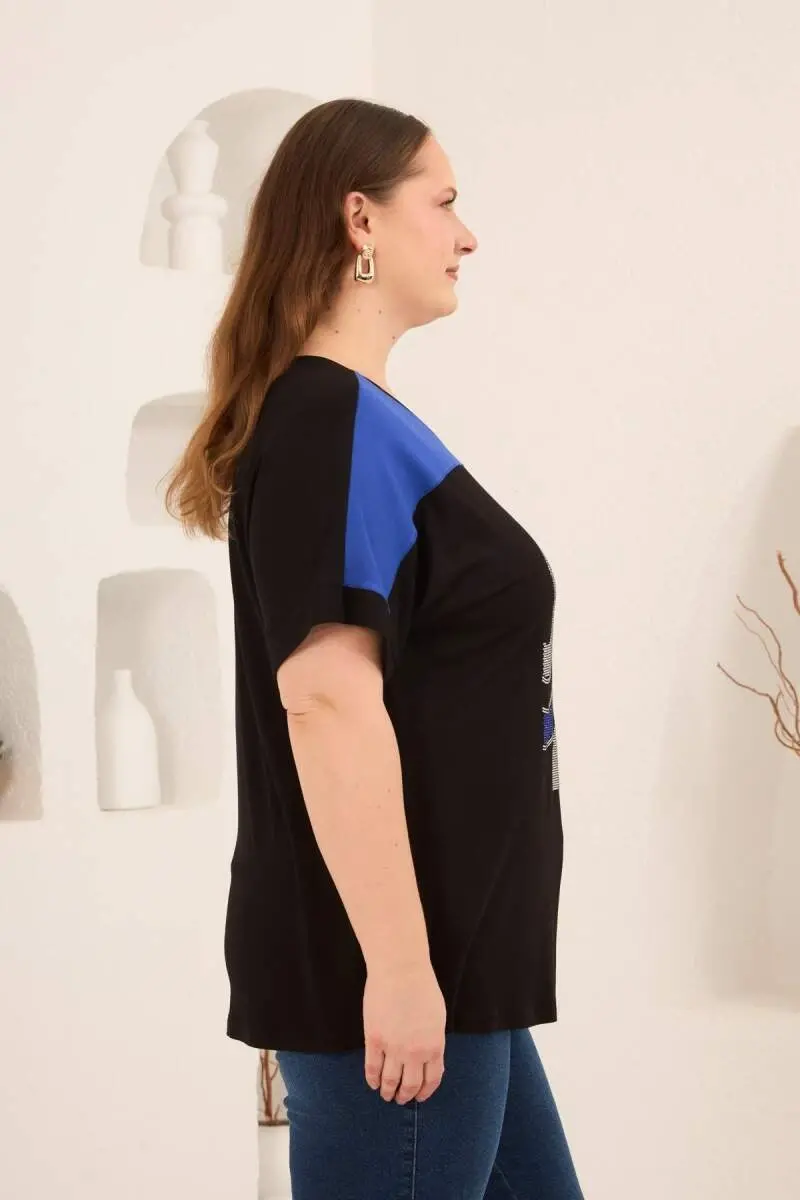 Taş Baskılı Büyük Beden Garnili Tişört Siyahsaks