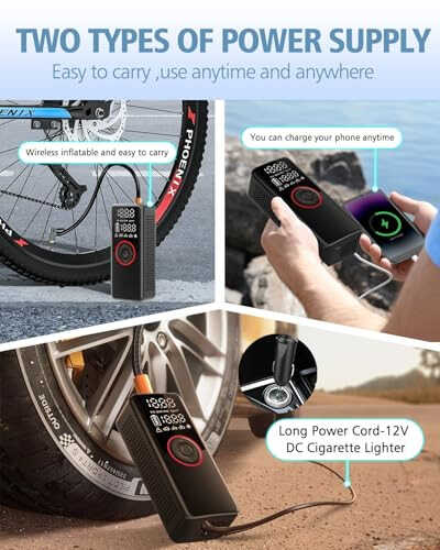 3X Faster Tire Inflation: The compact car tire inflator portable air compressor with a high performance motor and large 25mm cylinder can pump up a standard car tire from 0psi to 36psi within 6 minutes, top off a tire from 29psi-36psi within 1 minute, keeping you on the road all the time. 7500mAh Large Battery Capacity: The all-in-one portable air compressor for car tires has a power bank that allows you to pump up to 4 car tires, 10 motorcycles, 33 bicycles, 154 balls. The power bank can also be used to charge your phone or tablet so you are not stuck with out communication in an emergency. Dual Power Source: Can use the inflator with its battery source but or can use the inflator with the included DC 12V power cord. Just connect it to your car 12V power socket and off you go. 2 Mode Emergency Light: Bright white light for illuminating and mechanic use in the dark and flashing red light for emergency alert. The light lasts 9 hours for the bright white one and 18 hours for the red flashing emergency light. Accurate Pressure Gauge: Accurate digital pressure gauge so that you always know what pressure your car tire is at and will also automatically inflat your tire to your preset pressure value and shut off automatically.