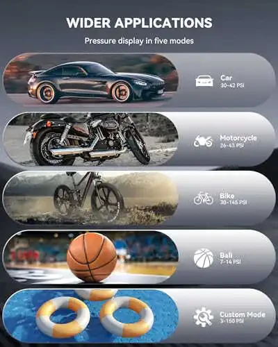 Tire Inflator Portable Air Compressor, sadece araç lastikleri için değil, motosiklet, bisiklet ve top gibi diğer eşyalarınızın lastiklerini şişirmek için de idealdir. Acil durum LED ışığı, gece veya karanlık ortamlarda size güvenli bir şekilde yardımcı olur.