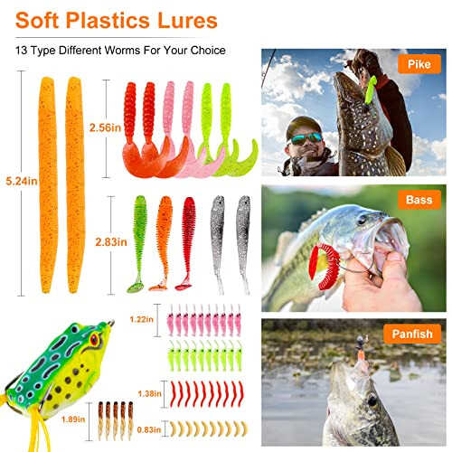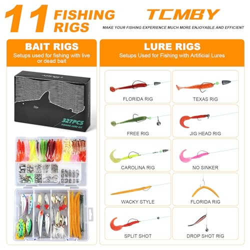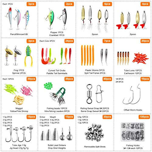 【Premium Fishing Tackle Kit】 - TCMBY high-quality fishing lures are designed for both beginners and experts, targeting species from bass to trout. This 327-piece fishing kit comes in a compact tackle box and includes nearly all essential fishing gear: Popper, Pencil, Minnow, Crankbait, VIB, Frog, Spinner, Spoon, Plastic Worms, Tube, Split Tail Fishes, Offset Hooks, Jig Head, Tube Jigs, Fishing Weights, Beads, Swivels, Snaps. Perfect for all fishing conditions, whether in freshwater or saltwater. 【Variety of Lures Combination】 - This 327-piece fishing set offers a comprehensive selection of lures and baits: 1 Crankbait, 1 Popper, 1 Pencil, 1 Minnow, 1 VIB, 1 Frog, 2 Split Tail Fishes, 10 Spinner Lures, 61 Soft Worms, 20 Soft Plastic Shrimp, 30 Split Shots, 10 Offset Hooks, 15 Jigs, 5 Drop Shot Weights, 10 Fishing Sinkers, 5 Fishing Leaders, 100 Hooks with Box, and more. It’s a reliable and versatile choice for any fishing enthusiast. 【High Quality Material】 - The lifelike lures, including Minnow, Popper, VIB, Pencil, and Crankbait, feature 3D eyes and ultra-realistic fish patterns to attract even the smartest fish. Made from high-quality anti-corrosion stainless steel and durable plastic, these fishing lures are built to last and perform in any water condition, whether fresh or saltwater. 【Easy to Carry Around】 - This compact fishing tackle set comes with a double-layer tackle box, making it easy to organize and access your fishing gear. Measuring 9.06 x 6.30 x 2.36 inches, it’s portable and fits perfectly in your fishing backpack or seat box. Take it with you to your favorite fishing spot and enjoy fishing anytime, anywhere. 【Best Gifts for Anglers】 - Whether for freshwater or saltwater fishing, this fishing lure set is an ideal gift for any angler. It includes a wide variety of baits and accessories suitable for all fishing occasions. Perfect for holidays like Father’s Day, Valentine’s Day, Thanksgiving, and Christmas, it’s a thoughtful gift for both beginners and experienced fishing enthusiasts.