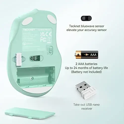 AAA batteries are not included. The USB receiver is stored at the back of the mouse. Please check the location of the receiver before use. Store your product in dry and clean environments for long-lasting use. If you have any questions or need assistance, do not hesitate to contact TECKNET customer service.