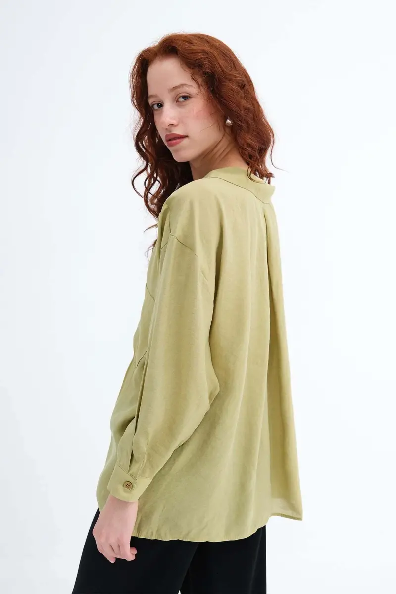 oversize gömlek, uzun kollu gömlek, yağ yeşili gömlek, tek cepli gömlek, pamuklu gömlek, kadın gömlek, rahat gömlek, günlük gömlek, oversize, yeşil gömlek