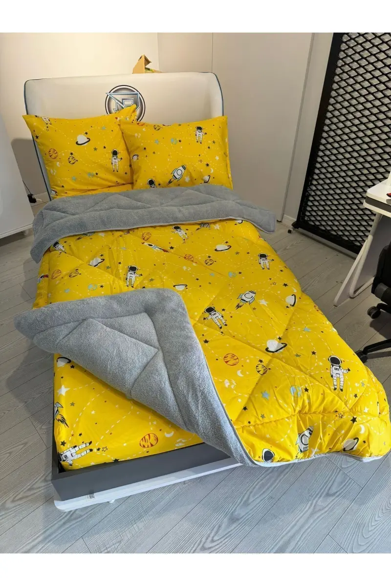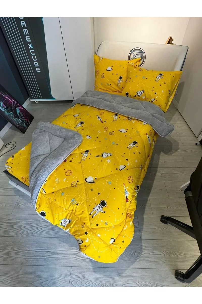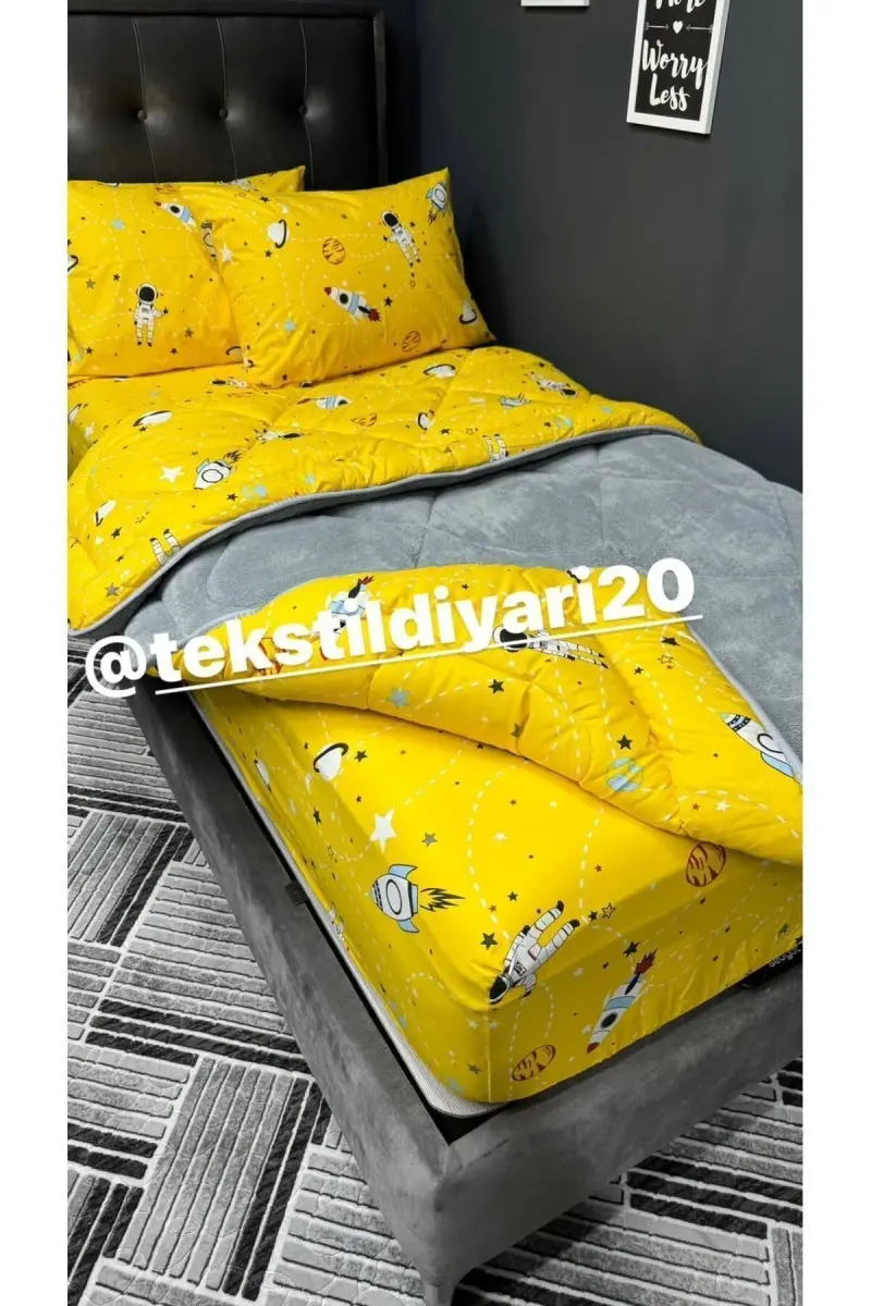 Tek Kişilik Welsoft Pufidik Uyku Seti (Lastikli Çarşaflı) Uzay Sarı-Sarı Gri