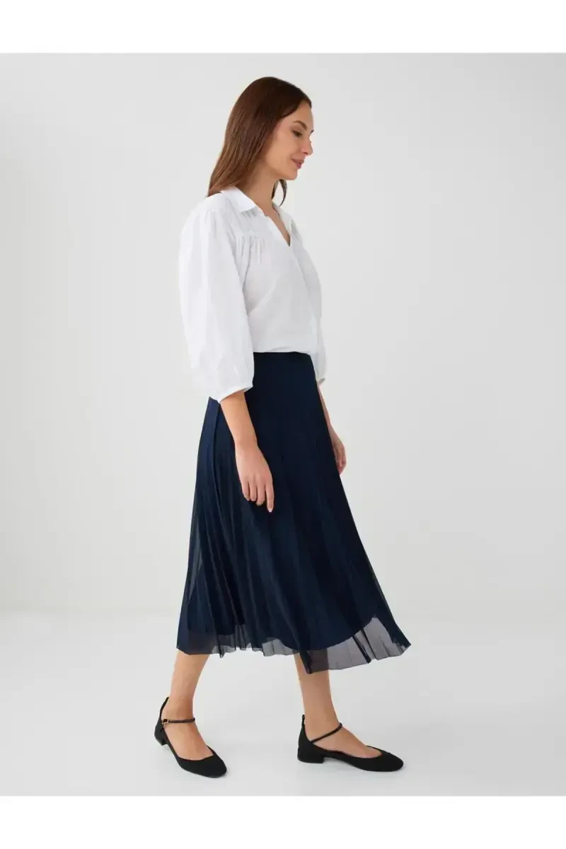 Темно-синяя юбка миди с высокой талией, плиссированная, свободного кроя.