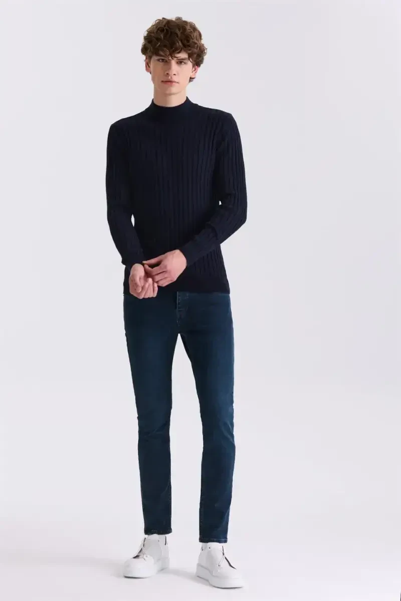 Тёмно-синий облегающий свитер с полукруглым вырезом Lacivert Slim Fit Yarım Balıkçı Triko Kazak: сочетание элегантности и комфорта