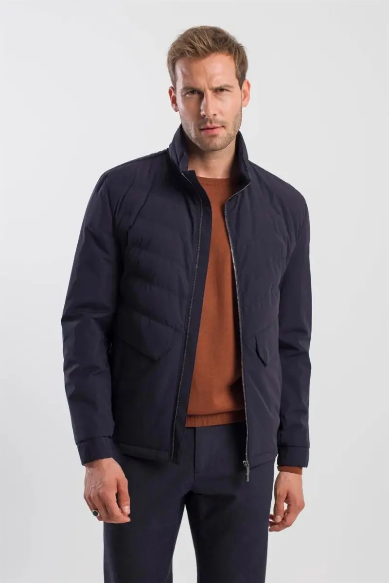 Спортивная куртка темно-синего цвета Comfort Fit со стойкой воротником идеально подойдет для активного образа жизни. Эта куртка изготовлена из прочной и эластичной ткани, состоящей из 85 % полиэстера и 15 % спандекса, что обеспечивает долговечность и свободу движений. Стойка воротника и свободный крой обеспечат вам тепло и комфорт в холодную погоду.