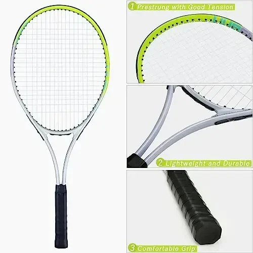 Хотите начать играть в теннис или улучшить свою текущую игру? Вот отличный стартовый набор! Приготовьтесь произвести впечатление на корте с помощью "Теннисной ракетки Pre-Strung Lightweight 27 Inch Racquet Recreational Adult Rackets for Men Women Students Training Tennis Starter Kit". Этот комплексный набор идеально подходит для всех, кто хочет войти в мир тенниса или провести приятную тренировку. В комплект входят 2 натянутые ракетки, сумка для переноски, 2 намотки и 3 теннисных мяча. Другими словами, все, что вам нужно, находится в одном пакете! Вы можете начать играть прямо сейчас. Большая головка ракетки площадью 105 квадратных дюймов сводит к минимуму вероятность промаха по мячу и добавляет силы вашим ударам, удерживая мяч в пределах корта. Эта функция особенно полезна для начинающих. Благодаря улучшенной стабильности и контролю вы можете быть более точными и эффективными в своих ударах. Легкая конструкция ракетки (около 0,58 фунта) предотвращает усталость рук, особенно во время длительных тренировок или матчей. Алюминиевый материал обеспечивает как долговечность, так и портативность ракетки. Этот небольшой вес помогает вам улучшить подачу, прием и другие техники ударов и поддерживает вас на пути к тому, чтобы стать сильным игроком. Этот набор теннисных ракеток - отличный выбор для мужчин, женщин, студентов и начинающих тренировки по теннису. Это также отличный вариант подарка. Он идеально подходит для того, чтобы подарить своим близким незабываемые моменты или отпраздновать их особые дни. У каждого в голове есть образ тенниса: социальный теннис, теннис для развлечения, уроки тенниса или семейные теннисные матчи... Где бы и когда бы это ни было, наслаждайтесь игрой в теннис со своими близкими с этим набором. Наслаждайтесь своей страстью к теннису на синих или зеленых кортах!