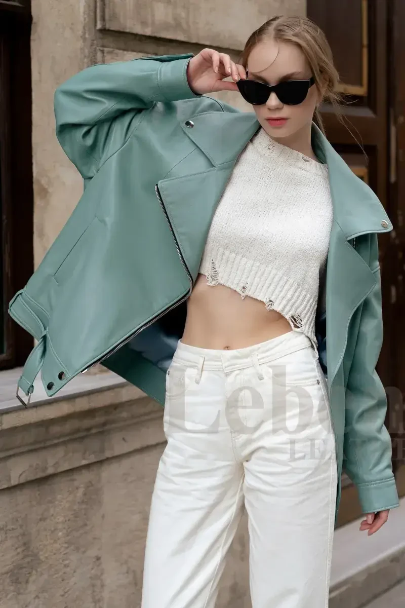 Teri Kurtka Ayol: Oversize Vintage Biker - Yashil Qo'y Teri Palto