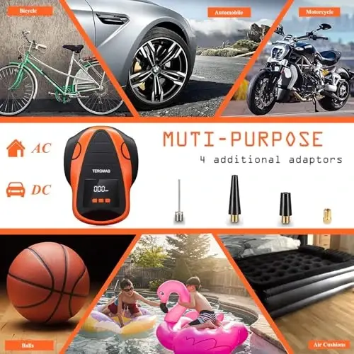 TEROMAS Tire Inflator portativ havo kompressori avtomobil shinalari uchun 12V DC va uyda 110V AC rozetka variantlari bilan noyob yechim taklif etadi. Ushbu ko'p qirrali havo nasosi shinalaringizni istalgan joyda osongina shishirish imkonini beradi. Raqamli displeyi va bosim o'lchagichi tufayli siz aniq va ishonchli natijalarga erishasiz. Yo'lda bo'lasizmi yoki uyda bo'lasizmi, TEROMAS havo kompressori har doim sizga yordam beradi. Bundan tashqari, mahsulot bilan birga keladigan adapterlar tufayli siz nafaqat avtomobil shinalarini, balki RV, mototsikl, velosiped shinalari, havo to'shaklari, shishiriladigan qayiqlar, to'plar va boshqa shishiriladigan narsalarni ham osongina shishirishingiz mumkin. Uning ixcham dizayni tufayli u avtomobilingizda yoki uyingizda minimal joy egallaydi. Qorong'i muhitda ham qulay foydalanish uchun yorqin LED chiroqlari bilan jihozlangan. TEROMAS havo kompressori favqulodda vaziyatlar uchun ideal vosita bo'lib, haydash paytida sizga hamroh bo'lib, har doim tayyor bo'lishingizni ta'minlaydi. Kuchli dvigateli tufayli shinalaringizni tez va samarali shishirishingiz mumkin. Oldindan sozlanishi bosim xususiyati bilan siz kerakli bosimga erishilganda avtomatik ravishda to'xtaydi, shuning uchun haddan tashqari shishirish xavfini yo'q qiladi. TEROMAS ishonchlilik, ko'chma va ko'p qirralilikni birlashtirib, har bir avtomobil egasi va uy foydalanuvchisi uchun ajralmas vositaga aylanadi. Bundan tashqari, mahsulotimiz bilan bog'liq har qanday muammoingiz bo'lsa, mijozlarga xizmat ko'rsatish xodimlarimiz har doim sizga yordam berishga tayyor. TEROMAS bilan shinalaringizni shishirish endi ancha oson va xavfsiz!