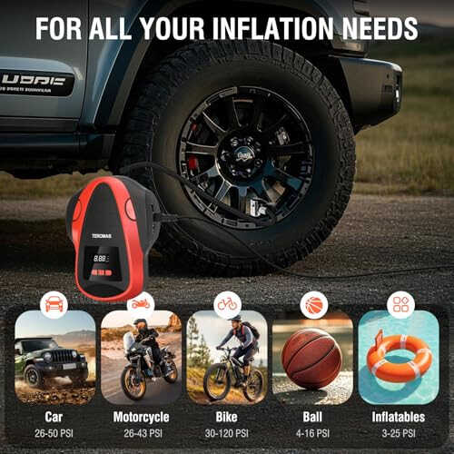 The TEROMAS Portable Air Compressor is designed to ensure your safety on the road and meet your inflation needs. Its durable construction and user-friendly features make it ideal for long-term use. It is a practical tool to have in your car, garage, or home. Please note that it is not suitable for heavy duty truck and tractor tires.