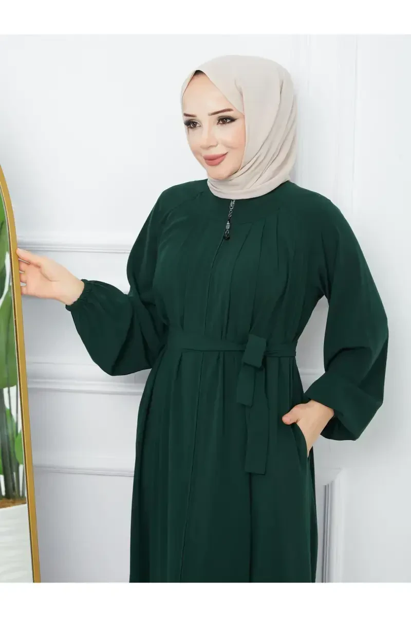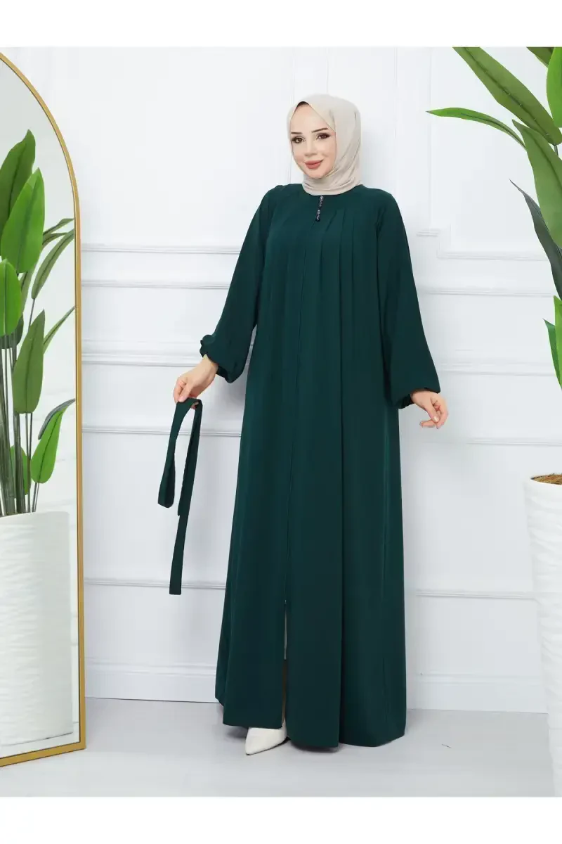 Bringing together elegance and comfort in modest fashion, the Medina Silk Robe Pleated Islamic Loose Fit Ferace Giy Çık Kap, especially in its green color, dazzles. This ferace, carefully designed by Moda Esre Fashion, offers a comfortable use all day long with the unique texture of Medina silk fabric. Thanks to its viscose blend, it stands out with its lightness and breathability, so you don't compromise on your comfort even in hot weather. Its wrinkle-resistant feature ensures you always look groomed and stylish. Its plain pattern and elegant green tone offer simplicity and elegance together, adapting to any environment. Its midi length offers an ideal length in modest wear, while it is also a practical option for daily use. Its regular fit provides a perfect fit for different body types, without restricting your freedom of movement. Its long sleeves and crew neck create a modern and elegant silhouette, while its standard sleeve type allows you to easily perform your daily activities. The belted design gently emphasizes your waist and offers adjustability according to your own style. The woven fabric increases the durability of the ferace and promises long-lasting use. This ferace will be an indispensable piece that will complement your elegance both on special occasions and in daily life. This ferace, which is a candidate to be one of the most loved pieces of your wardrobe, will always make you feel stylish and comfortable. This special design, produced with Moda Esre Fashion quality, brings a new breath to modest wear. This ferace, an ideal choice for those looking for elegance and comfort together, can be easily combined with other pieces in your wardrobe. Whether you create a sporty chic look with a daily combination, or create an elegant style at a special invitation, this ferace will accompany you in any situation. With the luxurious texture and careful workmanship of Medina silk, this ferace offers not only a garment, but also a lifestyle.