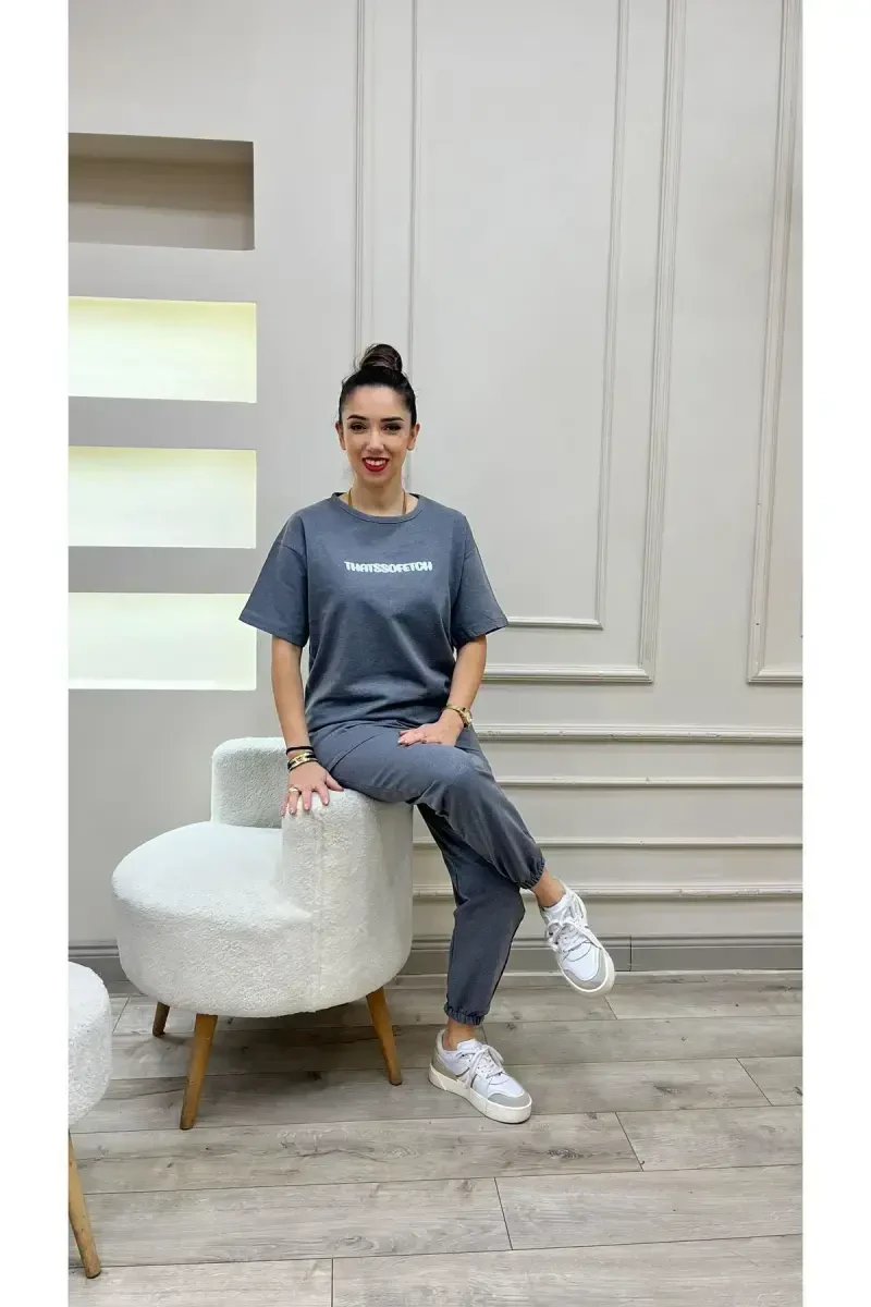Thatssofetch Füme Eşofman Takımı | Oversize Beyaz Baskılı Jogger